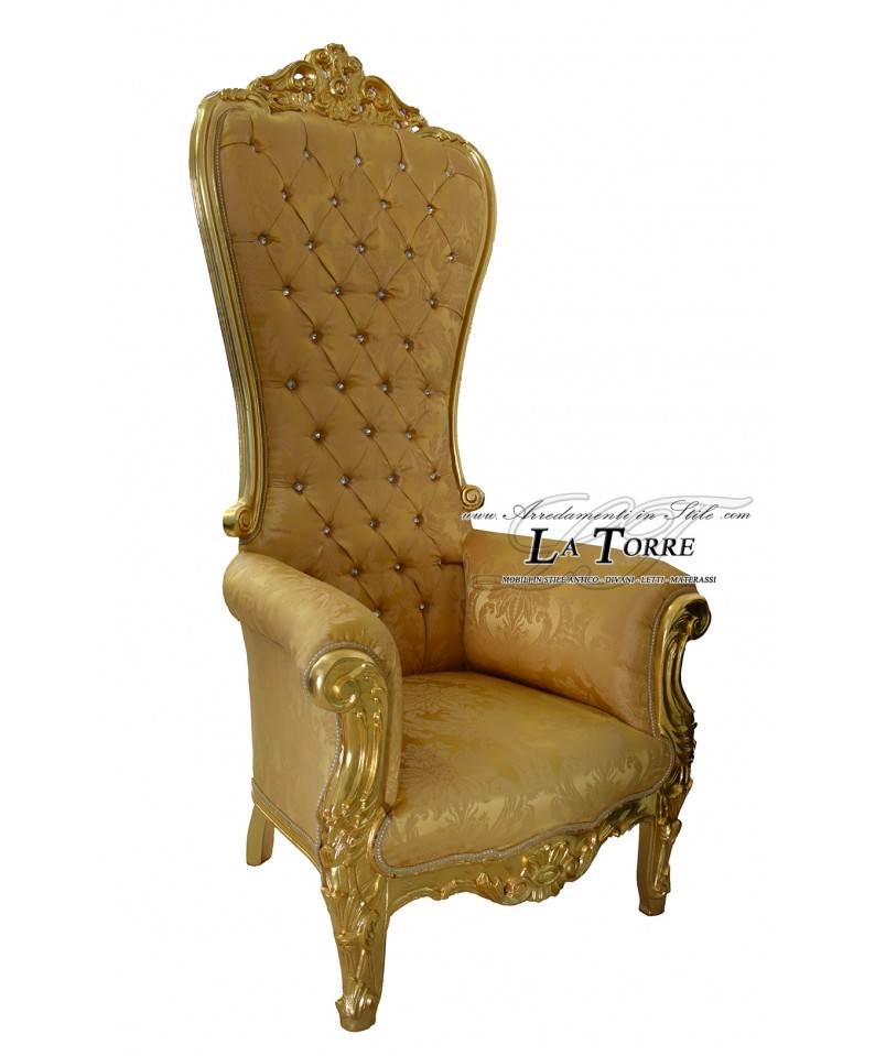 Poltrona trono stile Barocco struttura in foglia oro tessuto damascato oro Swarovski Ar7579