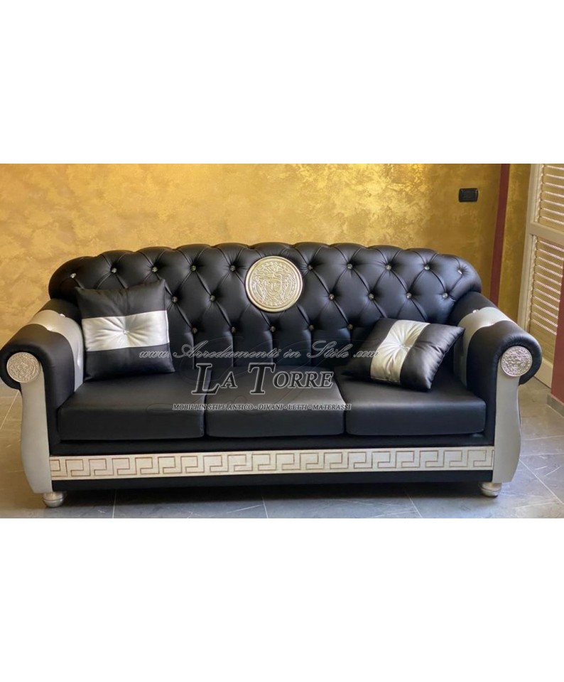 Divano 3 posti rete e materasso moderno Dea medusa con contrasto deciso tra l'ecopelle nera profonda e le scintillanti finiture argentate crea un'estetica di impatto, perfetta per un ambiente che esige raffinatezza e carattere. Lo schienale, finemente trapuntato con bottoni che richiamano lo stile classico Chesterfield, è il palcoscenico per un imponente medaglione argentato raffigurante la mitica Medusa, simbolo di potere e fascino intramontabile, che aggiunge un'aura di grandezza mitologica. Le fasce laterali e i braccioli sono adornati con audaci dettagli argentati, inclusi ulteriori medaglioni circolari che ne esaltano le forme. La base del divano è rifinita con l'iconico motivo a greca in argento, un richiamo al design classico e all'estetica sontuosa, elevato da eleganti piedini cromati. Completato da cuscini decorativi che aggiungono un tocco di morbidezza e stile, questo divano non è solo una seduta, ma un vero e proprio statement di lusso.
