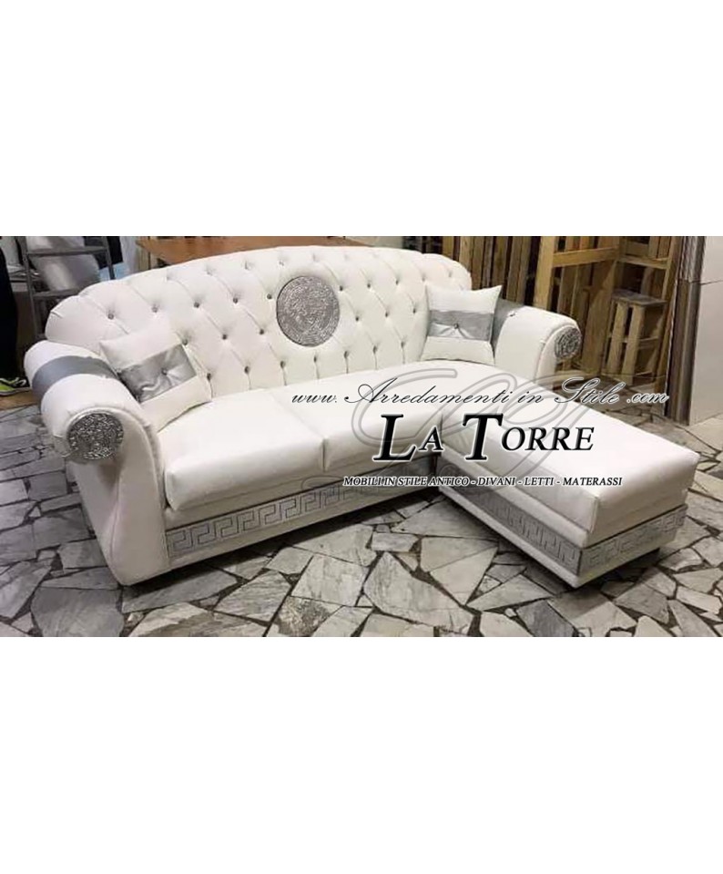 Divano 3 posti con penisola rete e materasso Chesterfield moderno Dea medusa ecopelle qualsiasi colore swarovski AZ05