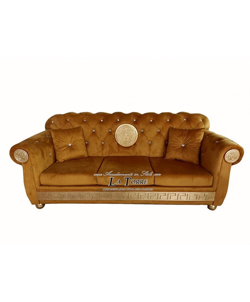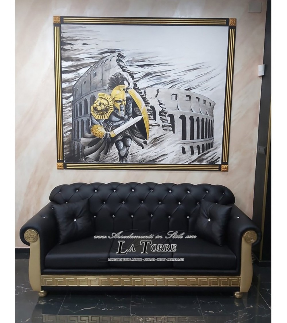 Divano letto 3 posti rete e materasso Chesterfield moderno, rivestito con una profonda ecopelle nera, elegante e versatile, crea un contrasto sorprendente e sontuoso con le ricche finiture dorate. Lo schienale, e la base, sono caratterizzati dalla classica trapuntatura capitonné, dove ogni bottone è sostituito da scintillanti "bottoni gioiello" che catturano e riflettono la luce, aggiungendo un tocco di glamour. I braccioli sono adornati da eleganti medaglioni circolari dorati, mentre la base del divano è impreziosita dal distintivo motivo a greca, anch'esso in oro, un richiamo all'opulenza e alla magnificenza dell'arte classica. Poggiato su piedini dorati, questo divano non è solo un mobile, ma un vero e proprio statement di stile, che invita al relax e alla conversazione in un ambiente di prestigio.