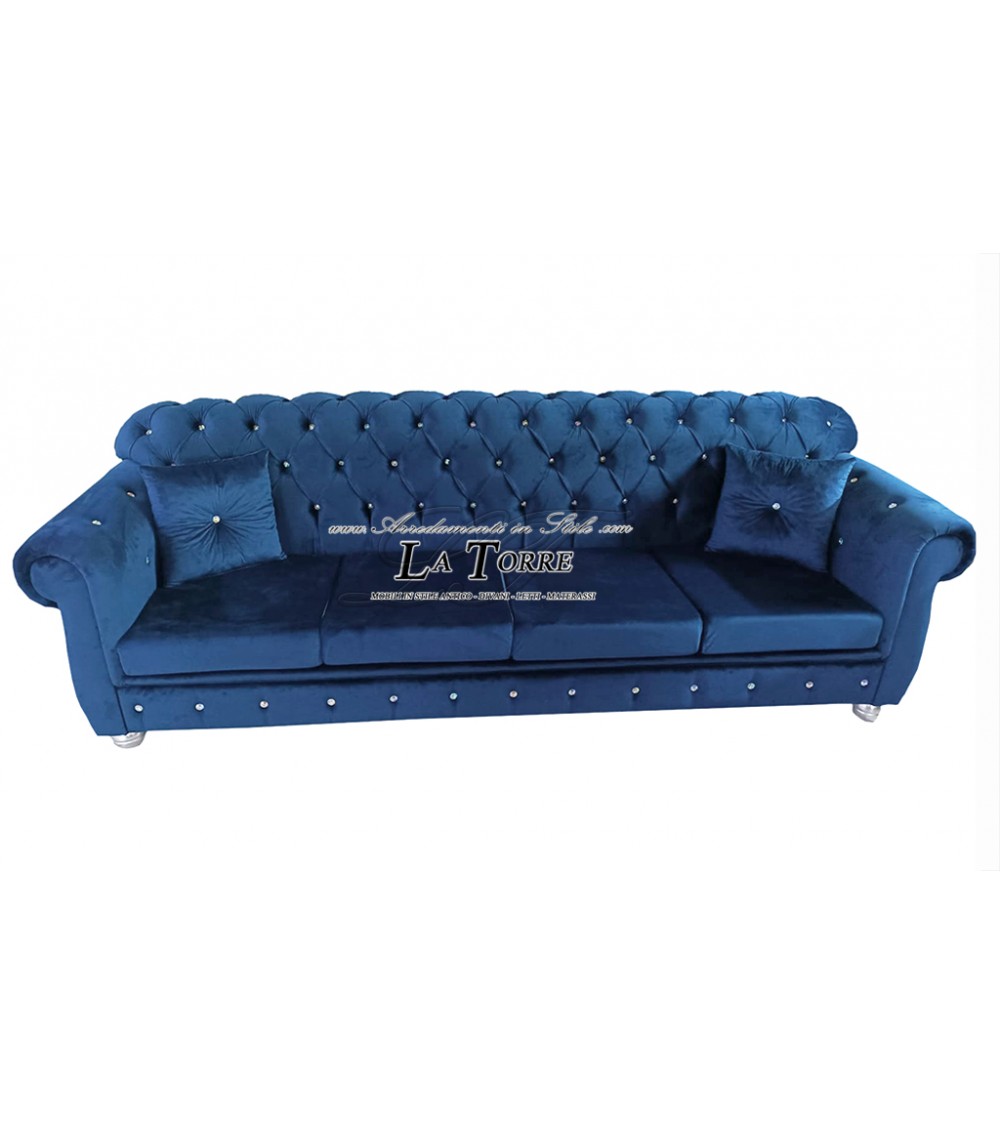 Divano 4 posti rete e materasso salotto moderno rivestito in un lussuoso velluto color blu oceano, lo schienale e la parte inferiore della base sono caratterizzati dalla distintiva trapuntatura capitonné, dove ogni bottone è sostituito da scintillanti "bottoni gioiello" che catturano e riflettono la luce, aggiungendo un tocco di glamour e brillantezza inaspettati. I braccioli curvi e le forme generose invitano al relax più assoluto. Poggiato su eleganti piedini cromati che ne esaltano la base, questo divano è completato da due cuscini decorativi, anch'essi in velluto blu e con un bottone centrale, che aggiungono un ulteriore strato di comfort e raffinatezza. Perfetto per un salotto che vuole distinguersi, offrendo ampio spazio per ospitare con stile o per godere di momenti di puro relax in un ambiente di raffinata opulenza.