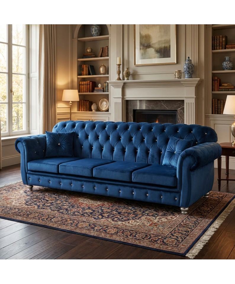 Divano Chesterfield 4 Posti Capitonné Blu Ecopelle o Velluto Bottoni Swarovski Rete Letto AZ04