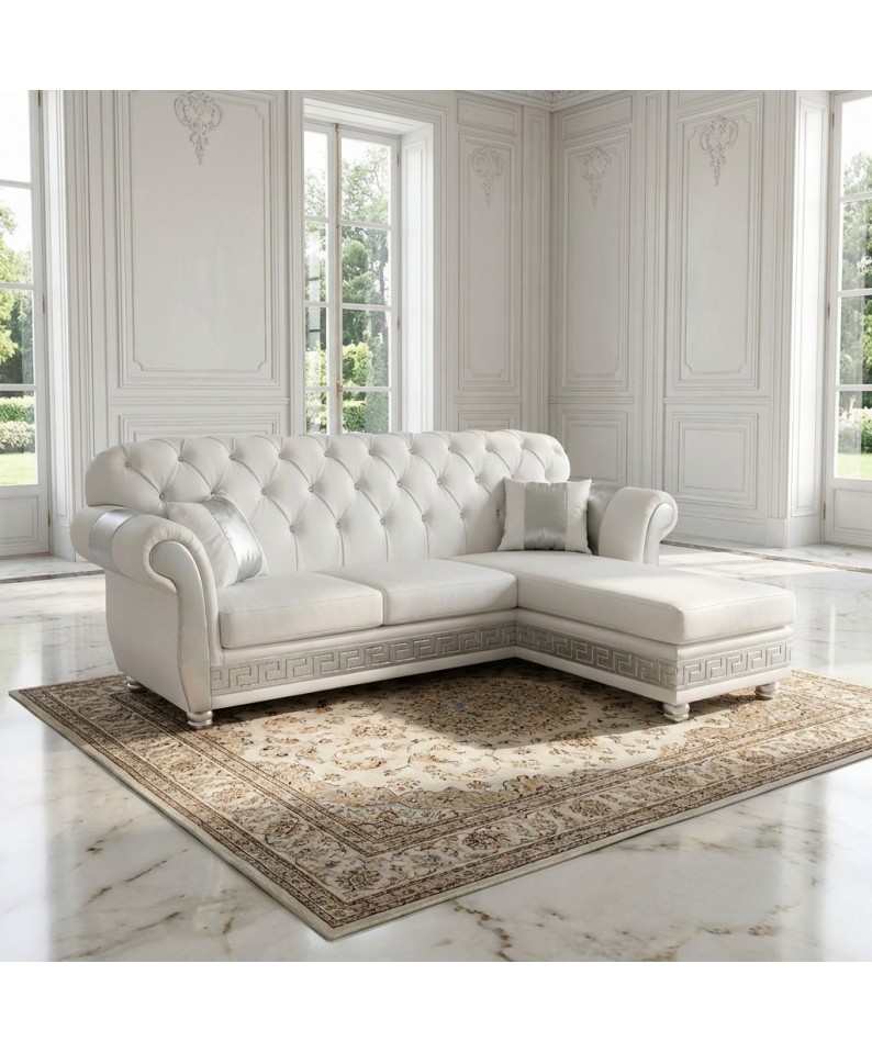 Divano 4 posti penisola rete e materasso chesterfield moderno dea medusa, rivestito in una raffinata ecopelle tessuto color crema o avorio, che illumina l'ambiente con la sua delicatezza, è un'ode all'eleganza barocca reinterpretata in chiave contemporanea. Lo schienale, un vero capolavoro di design, presenta l'iconica trapuntatura capitonné impreziosita al centro da un sontuoso medaglione dorato raffigurante l'emblematica Medusa, simbolo di potere e bellezza, che aggiunge un tocco di maestosità e un richiamo al design di alta moda. Le fasce laterali e i braccioli sono adornati da audaci dettagli dorati, inclusi ulteriori medaglioni circolari che ne esaltano le forme sinuose. La base del divano e della penisola è rifinita con l'iconico motivo a greca in oro, che conferisce un tocco di grandezza e continuità stilistica. Poggiato su eleganti piedini dorati, questo divano angolare non è solo un mobile, ma un vero e proprio statement di stile, ideale per un salotto che desidera distinguersi per raffinatezza e opulenza.