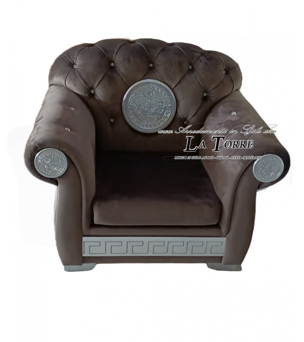 Poltrona divano rete e materasso chesterfield Dea Medusa braccioli moderno, rivestita in un sontuoso velluto marrone scuro che evoca calore e sofisticazione. Un pezzo d'arredo che non passa inosservato, grazie ai suoi distintivi dettagli argentati che ne esaltano il design. Lo schienale, caratterizzato dalla classica trapuntatura capitonné con bottoni, è impreziosito da un'imponente medaglione argentato con l'iconica figura della Medusa, un simbolo di forza e stile che richiama il design di alta moda. Anche i braccioli sono adornati da eleganti medaglioni circolari in argento, che aggiungono un tocco di grandezza. La base della poltrona è rifinita con un raffinato motivo a greca in argento, un dettaglio che unisce la tradizione classica a un'estetica moderna e audace.