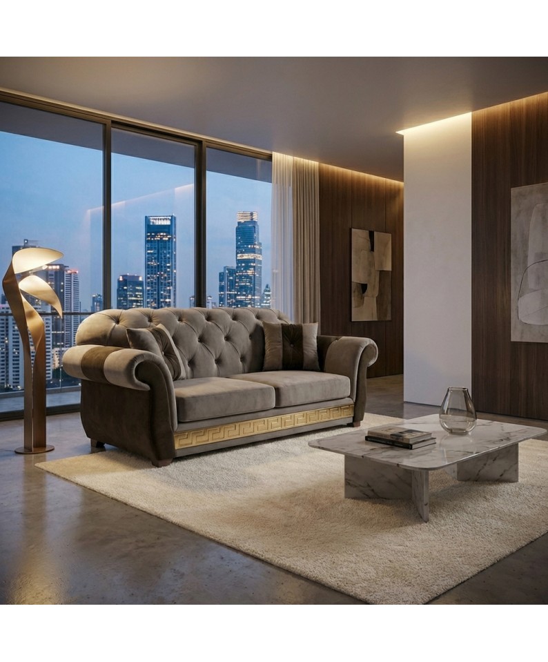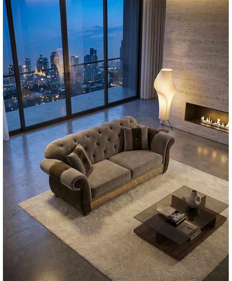 La lavorazione capitonné artigianale, realizzata con estrema precisione, esalta le linee morbide e avvolgenti del divano, conferendo profondità e prestigio al design. I braccioli arrotondati e la seduta ampia garantiscono massimo comfort e una sensazione di accoglienza immediata.