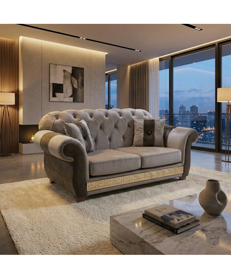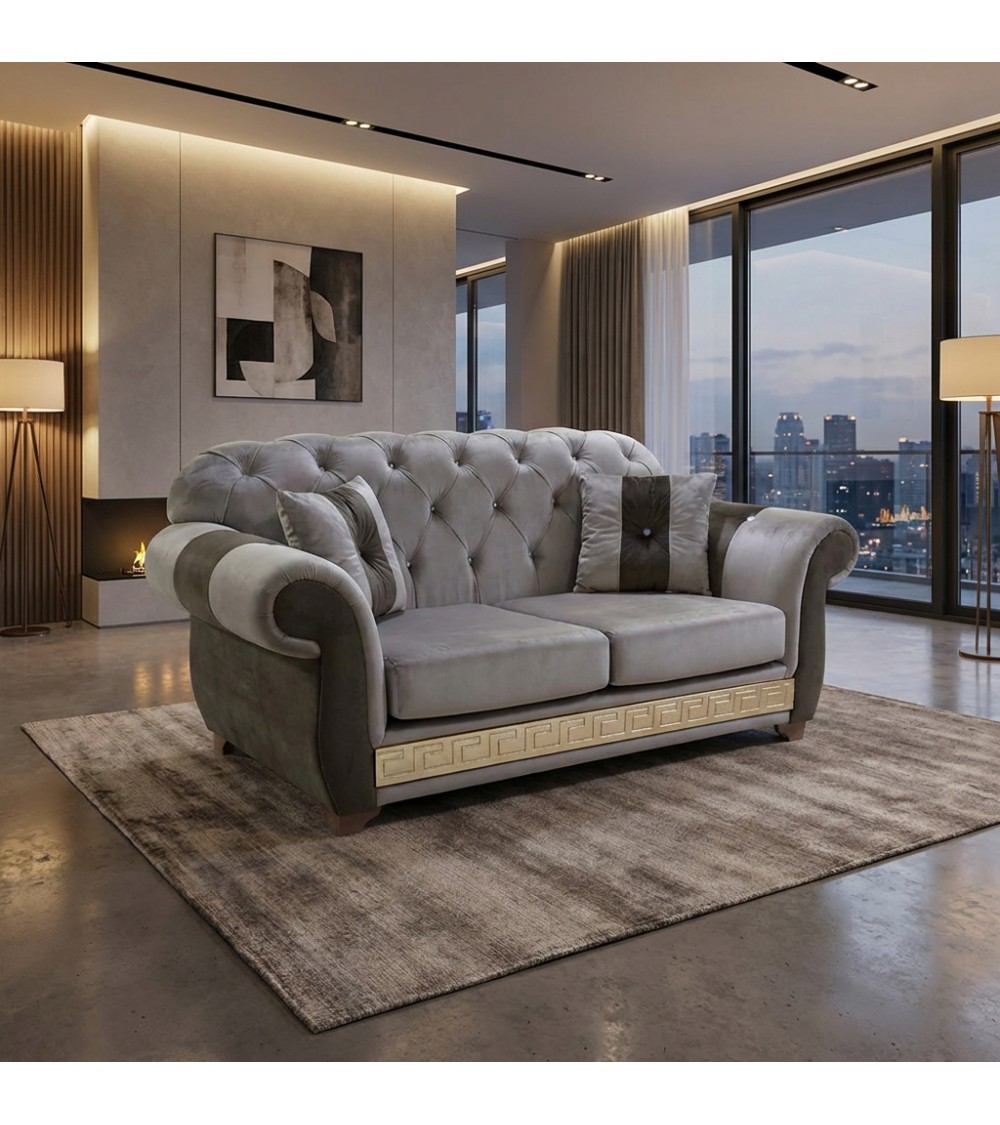 Il Divano Letto Chesterfield 2 Posti AZ02 in elegante tonalità grigio rappresenta la scelta perfetta per chi desidera un arredo raffinato, versatile e senza tempo. Il colore neutro si adatta con facilità a qualsiasi ambiente, dal moderno al classico, mantenendo sempre un forte impatto estetico.
