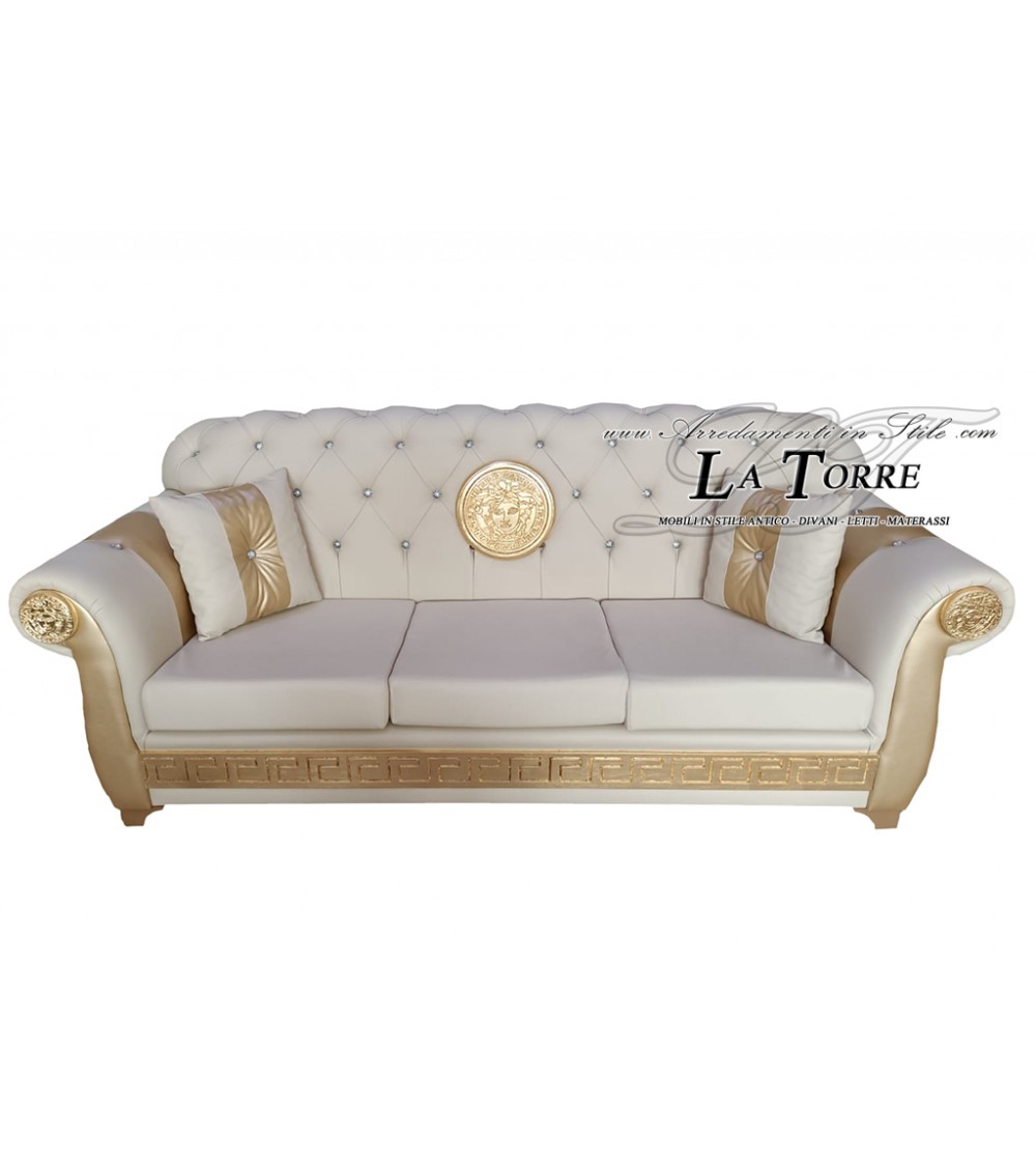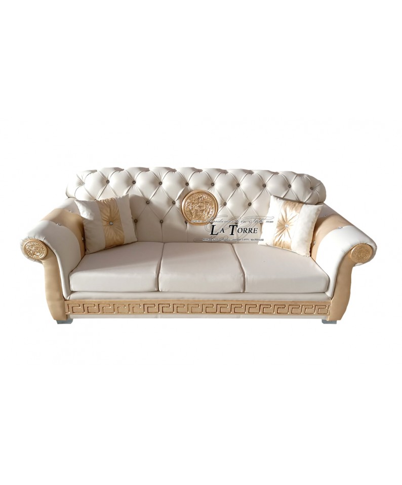 Divano letto 3 posti rete e materasso Chesterfield moderno Dea Medusa un'espressione sublime dello stile barocco in bianco e oro il suo rivestimento bianco brillante probabilmente in pelle di alta qualità o un tessuto pregiato contrasta magnificamente con gli elaborati elementi dorati lo schienale è profondamente capitonné conferendo un'eleganza classica ma è l'imponente medaglione dorato centrale che evoca il motivo della Medusa o simboli regali ad accentuarne il carattere sontuoso i braccioli sono riccamente rifiniti in oro con elaborati motivi scultorei che ne esaltano la sontuosità mentre la base è decorata con una fascia dorata che mostra un classico motivo a greca rafforzando il suo inconfondibile stile barocco due cuscini decorativi con fasce dorate e bordi bianchi completano l'aspetto regale e invitante questo divano è un vero e proprio pezzo d'arte pensato per dominare un salotto con grandiosità e un lusso senza compromessi.