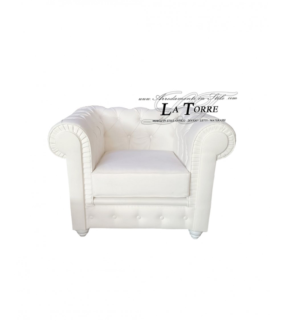 Poltrona divano chesterfield moderno con rivestimento bianco immacolato in ecopelle, il suo iconico schienale e i braccioli profondamente capitonné che creano una texture ricca e avvolgente le sue linee morbide e le proporzioni generose offrono una seduta estremamente confortevole la cura dei dettagli è evidente nella lavorazione artigianale dei bottoni e delle pieghe del rivestimento mentre i robusti piedini bianchi aggiungono stabilità e completano l'aspetto elegante questa poltrona rappresenta un elemento d'arredo senza tempo capace di integrarsi con stile sia in ambienti classici che contemporanei aggiungendo un tocco di raffinata sobrietà e lusso discreto.
