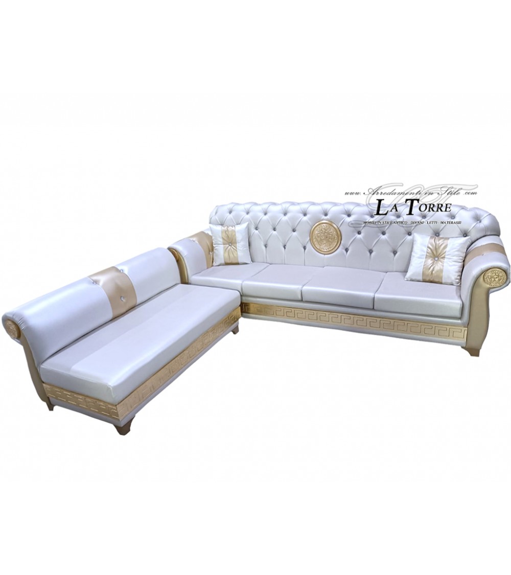 Divano 4 posti penisola schienale rete e materasso Chesterfield moderno. Il suo rivestimento in ecopelle bianco arricchito da lussuosi dettagli dorati la configurazione a Elle offre ampi spazi per sedersi e un comodo elemento chaise longue lo schienale è profondamente capitonné un richiamo elegante al design Chesterfield che si fonde perfettamente con l'opulenza barocca gli accenti dorati brillano su braccioli base e medaglioni decorativi forse con un motivo Medusa che aggiunge un ulteriore tocco di fasto barocco la base del divano presenta un motivo geometrico ripetuto in oro esaltando ulteriormente il suo inconfondibile fascino barocco due piccoli cuscini decorativi coordinati con motivi bianchi e oro completano l'estetica generale questo divano è chiaramente un pezzo importante pensato per un grande salotto o un ambiente che ricerca un'atmosfera sontuosa e sofisticata in puro stile barocco.