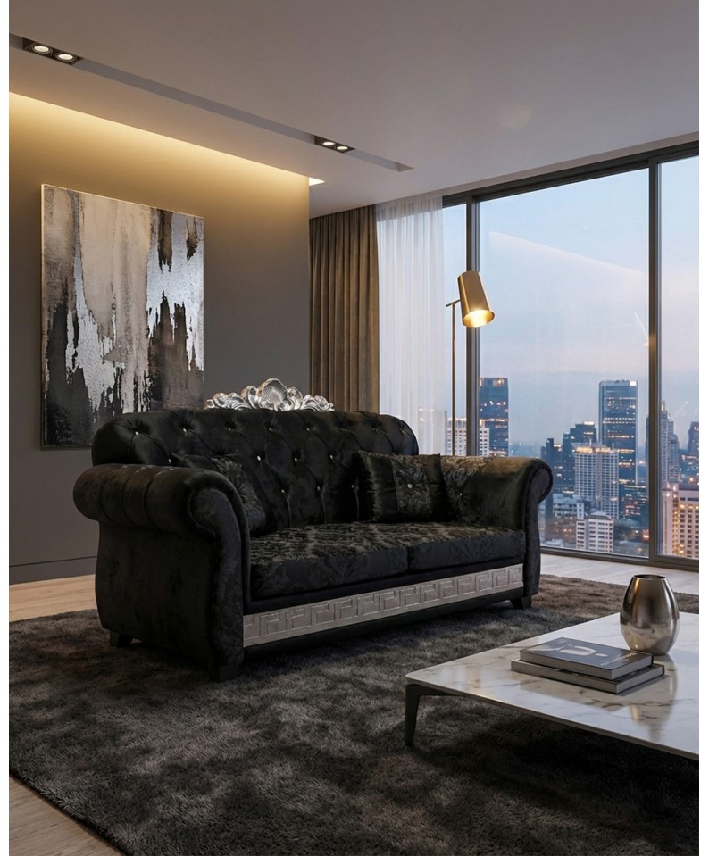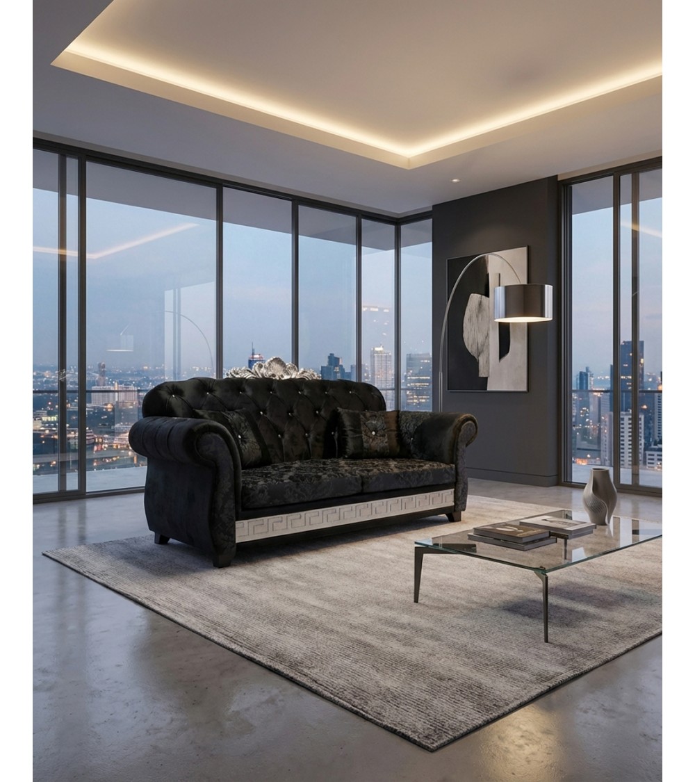Il Divano Letto Chesterfield 2 Posti AZ02C rappresenta l’essenza del lusso contemporaneo, dove il fascino senza tempo dello stile classico incontra un’eleganza moderna e sofisticata. Il rivestimento in tessuto damascato nero dona profondità e carattere, rendendo questo modello una scelta esclusiva per ambienti di alto livello.