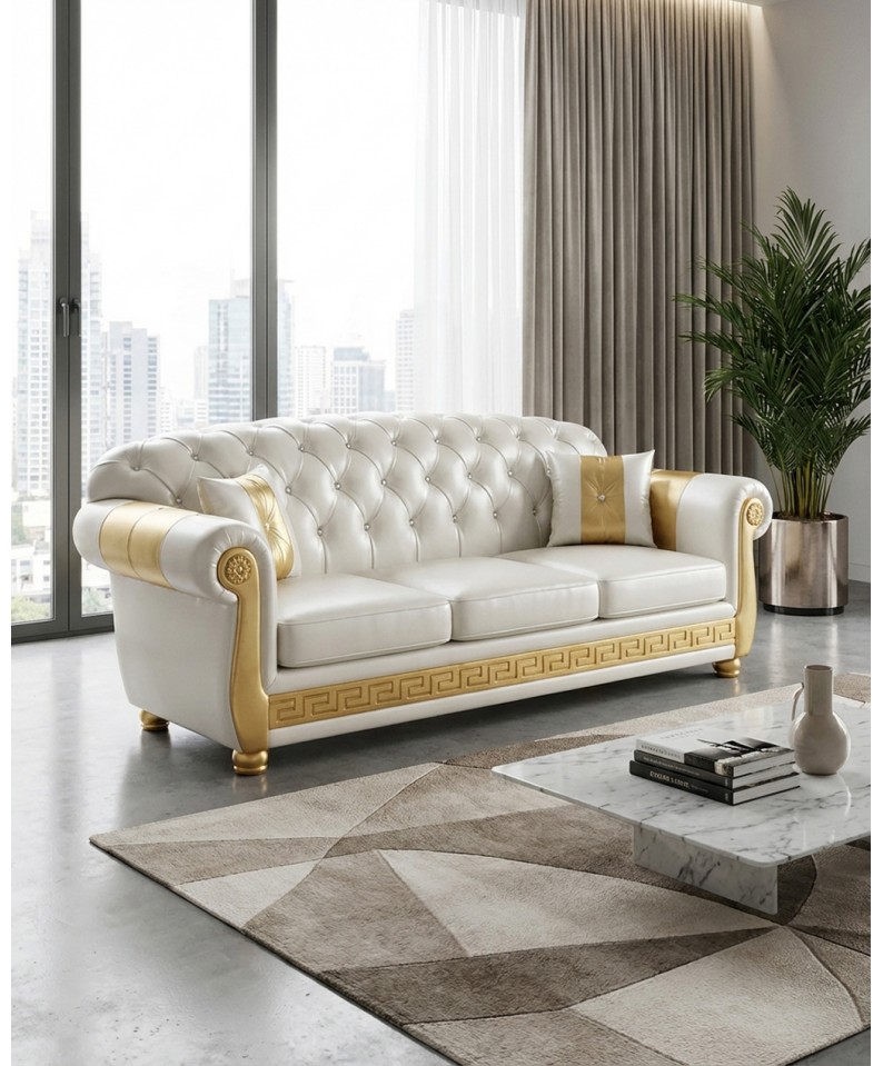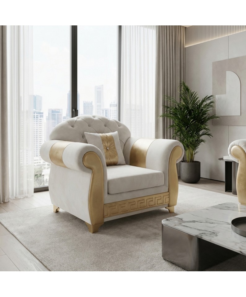 La poltrona Chesterfield in finitura avorio e oro rappresenta un perfetto equilibrio tra eleganza classica e design contemporaneo, ideale per ambienti raffinati e luminosi.