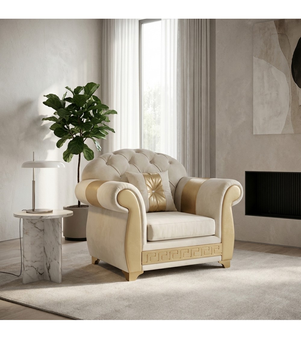 I braccioli dalle forme sinuose, arricchiti da inserti dorati, e la base decorata con elegante motivo a greca, rendono questa poltrona un elemento distintivo e di grande impatto estetico.