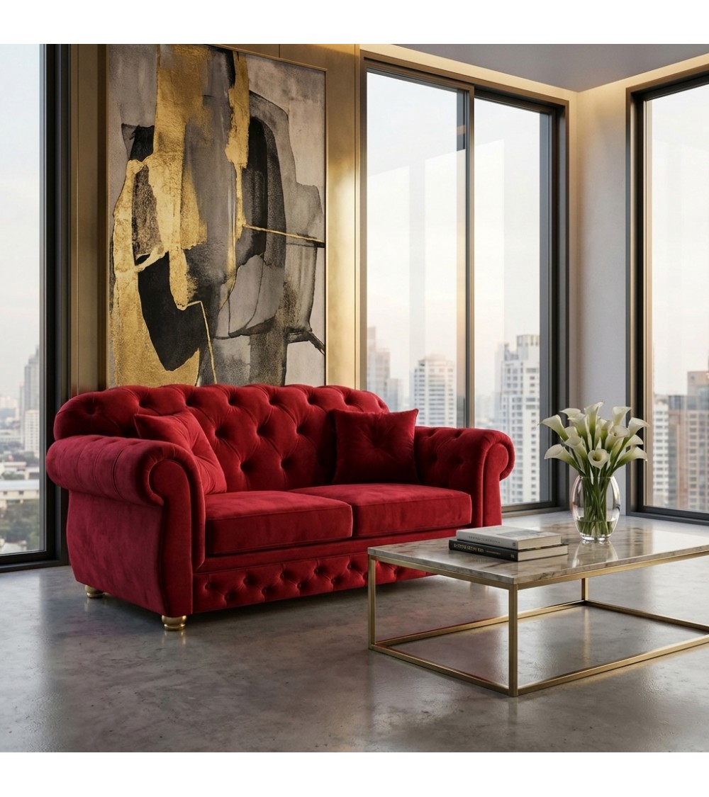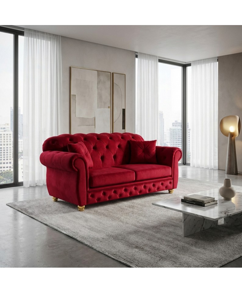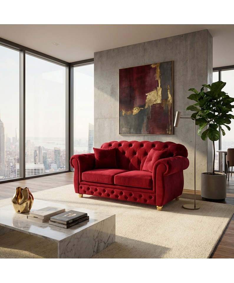 Il Divano Letto Chesterfield 2 Posti AZ02 è una perfetta espressione di eleganza e carattere, pensato per chi desidera un arredo capace di distinguersi. Il rivestimento in velluto rosso, intenso e sofisticato, esalta le forme classiche del modello, rendendolo protagonista assoluto dell’ambiente.