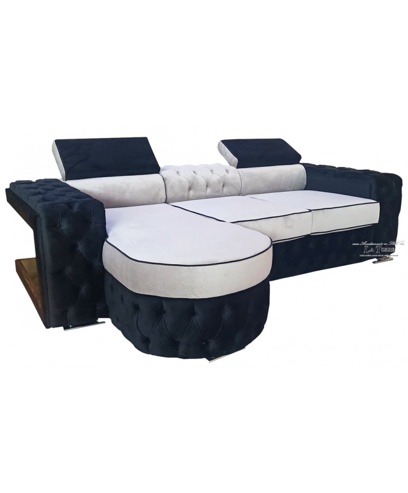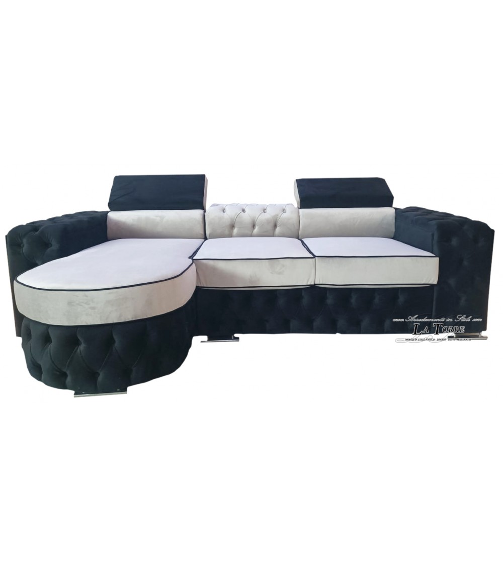 Divano 3 posti con penisola, dal design audace e contemporaneo, che si distingue per il suo contrasto cromatico e l'integrazione di funzionalità moderne. Il divano è rivestito in un lussuoso tessuto vellutato, con un'elegante combinazione di nero o grigio antracite per la struttura principale e bianco per le sedute e i cuscini dello schienale. La caratteristica più distintiva è la combinazione di texture e colori: i braccioli, ampi e squadrati, e la parte inferiore della struttura sono impreziositi da una profonda trapuntatura a capitonné, che aggiunge un tocco di eleganza classica e profondità visiva. Si notano anche bottoni luminosi o in cristallo sulla trapuntatura dei braccioli, che aggiungono un tocco di brillantezza.La configurazione angolare include una penisola arrotondata sulla sinistra (guardando il divano), che offre un ampio spazio per distendersi. Le sedute sono ampie e lisce, di colore chiaro, con un bordo scuro a contrasto che le profila. Lo schienale è composto da sezioni reclinabili con poggiatesta che possono essere alzati, offrendo un supporto ergonomico personalizzabile e un comfort ottimale.