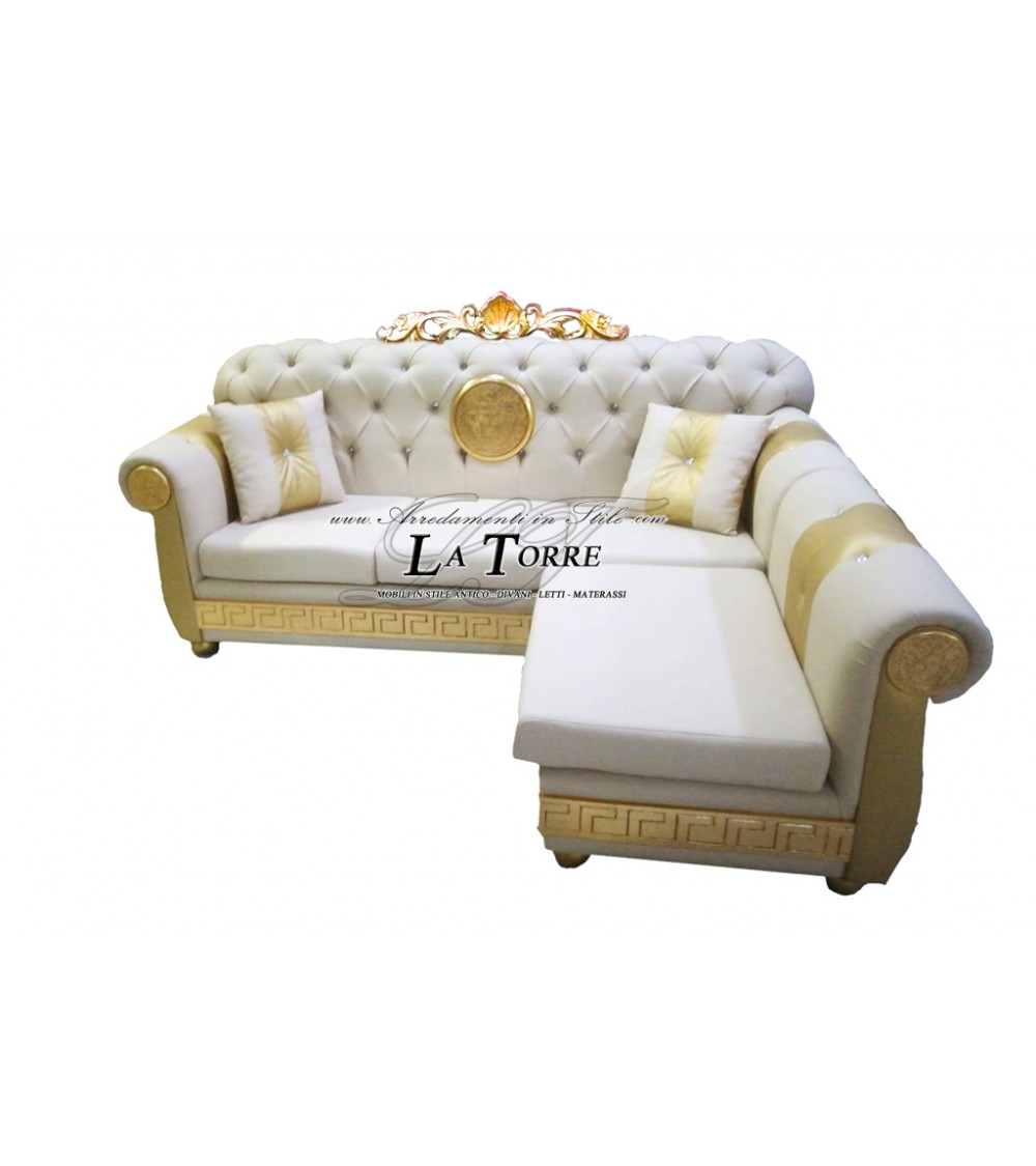 Divano 3 posti con rete e materasso penisola Dea Medusa Chesterfield è un sontuoso divano angolare, che incarna un'eleganza classica e opulenta con dettagli distintivi. Il divano è rivestito in una luminosa ecopelle  di colore champagne con particolari oro, che gli conferisce un'aura di raffinatezza e splendore. La caratteristica più distintiva è la profonda trapuntatura a capitonné, che adorna l'intero schienale e si estende parzialmente sui braccioli. Questa lavorazione, con bottoni che creano un classico motivo a losanghe, aggiunge profondità visiva e un'eleganza senza tempo. Al centro della parte superiore dello schienale, spicca una sontuosa decorazione dorata intagliata, rappresentante la Dea medusa, che evoca lo stile barocco e aggiunge un tocco di regalità.