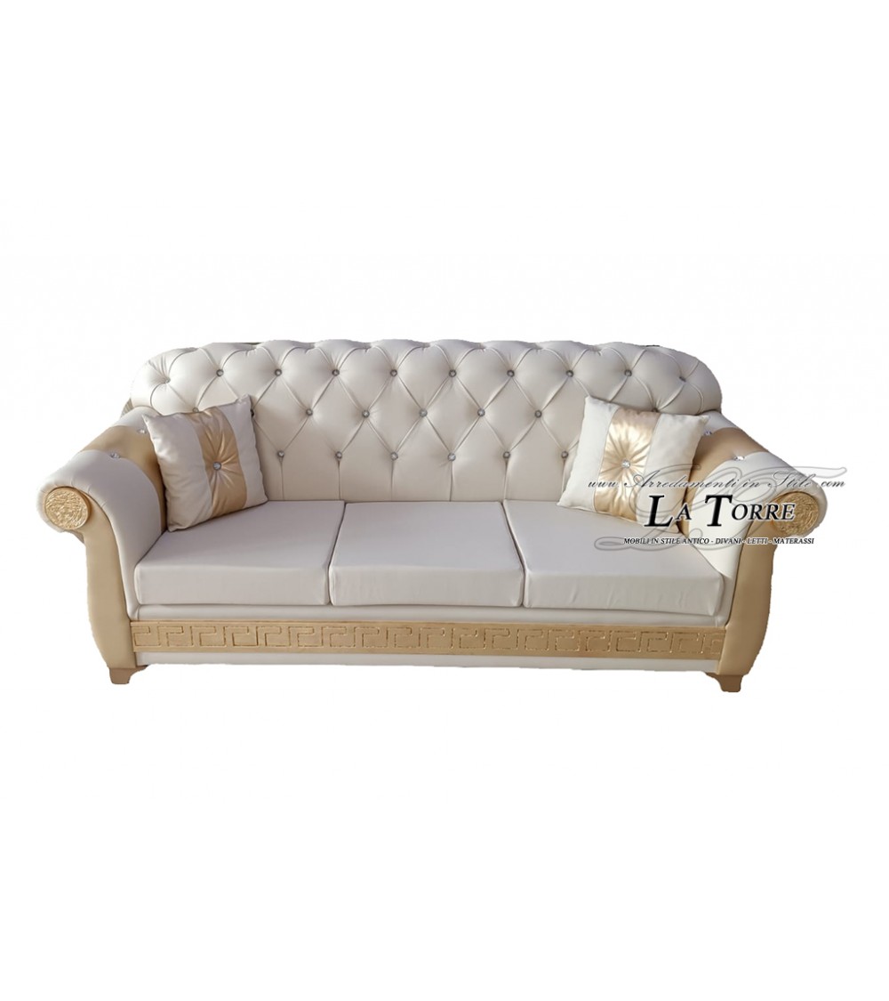 Divano letto 3 posti rete e materasso Chesterfield moderno , che incarna un'eleganza classica e opulenta con dettagli distintivi. Il divano è rivestito in un luminoso tessuto di colore bianco crema o avorio, che gli conferisce un'aura di raffinatezza e splendore. La caratteristica principale è la profonda trapuntatura a capitonné, che adorna l'intero schienale e si estende verso i braccioli, creando un classico motivo a losanghe con bottoni. Questo dettaglio aggiunge profondità visiva e un'eleganza senza tempo. I braccioli, dalla forma arrotondata e voluminosa, sono parzialmente rivestiti con lo stesso tessuto e parzialmente con un inserto dorato sulla parte esterna, che si estende fino alla base del divano. La base frontale del divano è impreziosita da una fascia dorata decorata con un fregio a greca, un motivo classico che aggiunge ulteriore prestigio e richiamo all'antichità. La seduta è composta da tre cuscini separati, ampi e lisci, senza trapuntatura, che offrono un contrasto con la ricchezza dello schienale e garantiscono un comfort elevato. Due cuscini decorativi, con un motivo a righe o raggiera in tonalità oro su sfondo chiaro, completano l'estetica lussuosa.