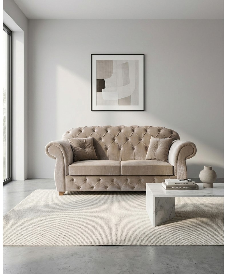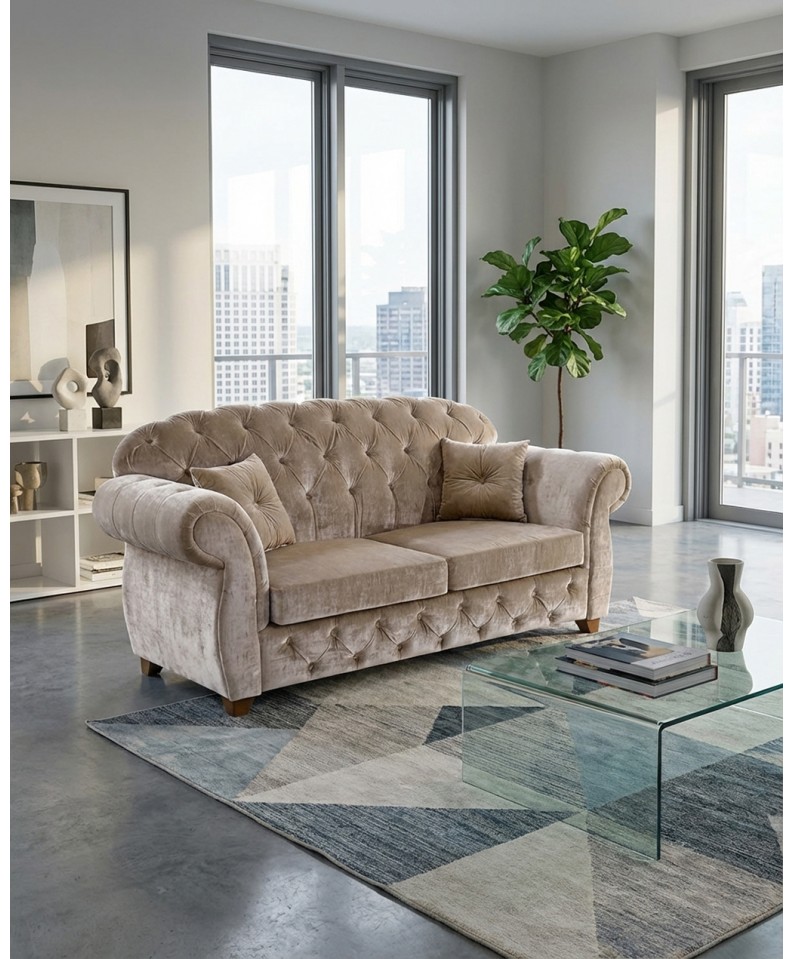 La struttura compatta e proporzionata lo rende perfetto anche per spazi più contenuti, senza rinunciare al comfort e alla presenza scenica tipica dello stile Chesterfield. I braccioli arrotondati e la cura nei dettagli esaltano ulteriormente il carattere esclusivo del divano.