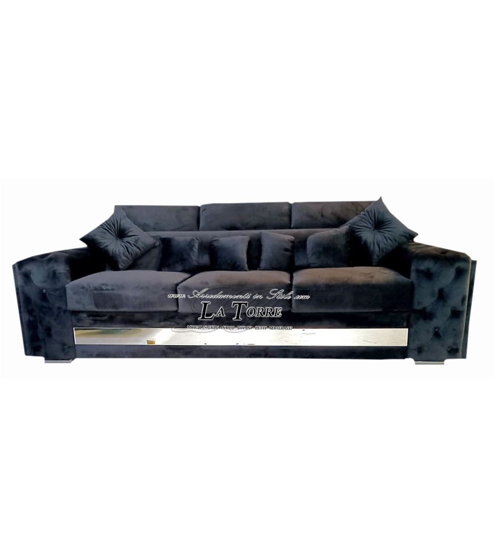 Divano letto 3 posti rete e materasso moderno e sofisticato, che si distingue per il suo rivestimento in un lussuoso tessuto vellutato di colore nero. Il divano presenta linee pulite e geometriche, con un'enfasi sulla texture e sui dettagli lucidi. I braccioli, dalla forma squadrata e robusta, sono impreziositi da una discreta trapuntatura a capitonné sul lato esterno inferiore, che aggiunge un tocco di classica raffinatezza. La parte inferiore della struttura è caratterizzata da un'ampia fascia orizzontale in metallo cromato o lucido, che corre lungo tutta la lunghezza del divano, riflettendo l'ambiente circostante e aggiungendo un elemento di glamour e modernità. Le gambe, seppur non completamente visibili, sembrano essere basse e robuste, anch'esse in metallo lucido, contribuendo alla stabilità e al design contemporaneo. La seduta è composta da cuscini ampi e lisci, ben imbottiti, che offrono un comfort elevato. Lo schienale è formato da una serie di cuscini separati, che sembrano essere molto morbidi e accoglienti.