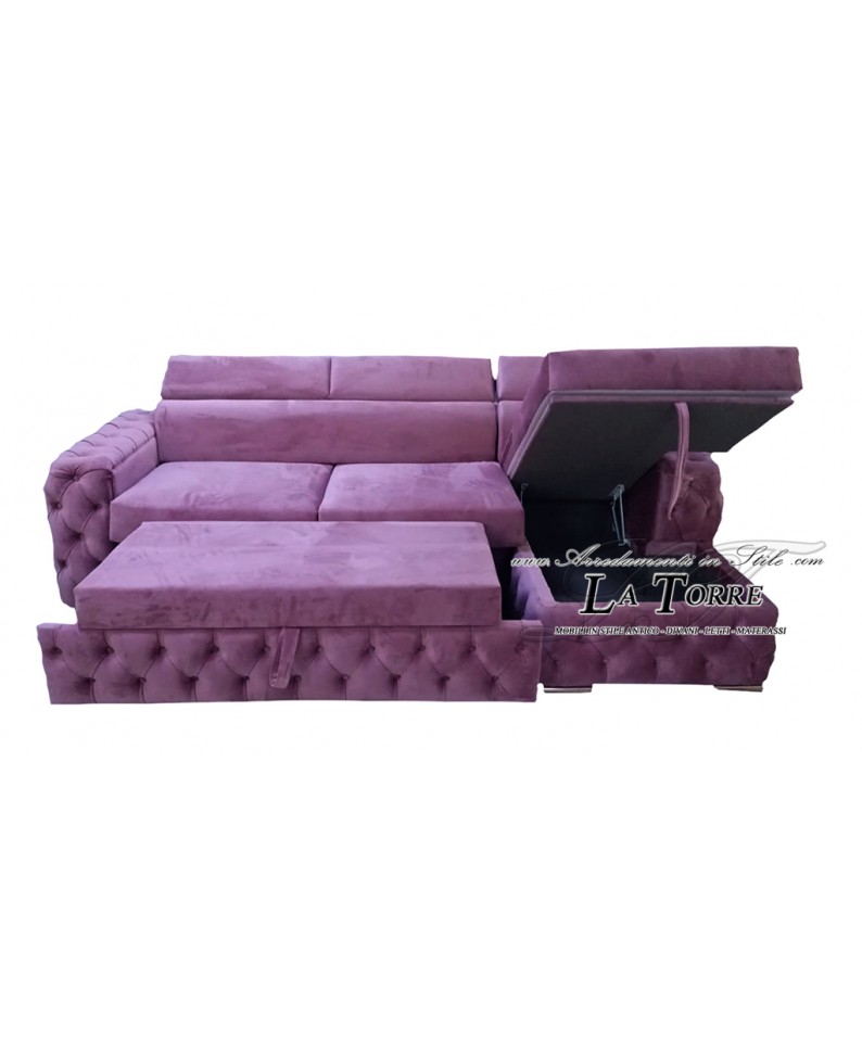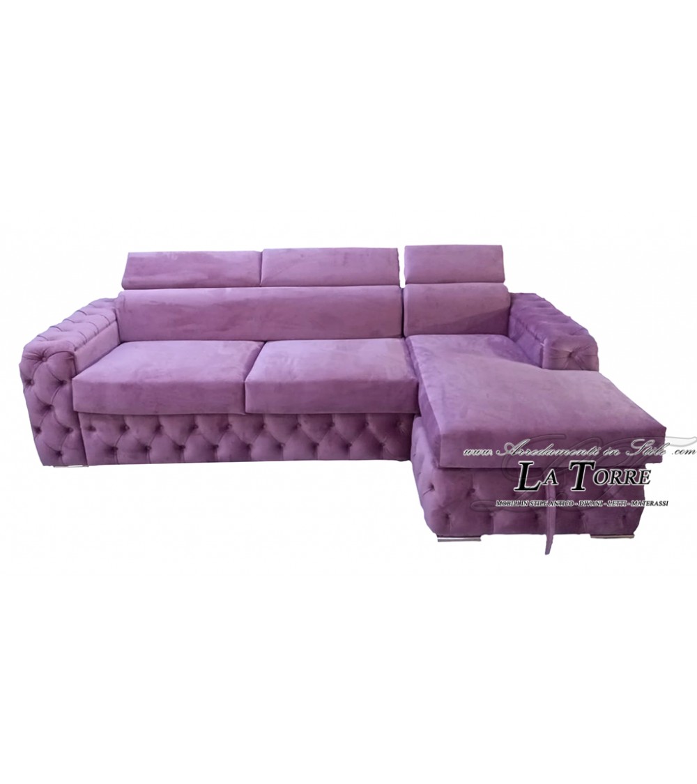 Divano letto 3 posti rete e materasso con penisola Chesterfield moderno che si distingue per il suo vibrante rivestimento in tessuto vellutato color viola . Il divano presenta un'interessante fusione di stili: la parte inferiore della struttura e il bracciolo sinistro sono impreziositi da una profonda trapuntatura a capitonné, che richiama l'eleganza classica del design Chesterfield. Questa lavorazione, con bottoni che creano un motivo a losanghe, aggiunge texture e profondità. I braccioli sono ampi e robusti, invitando al comfort. La configurazione angolare include una spaziosa chaise longue sulla destra (guardando il divano), che offre un'ampia superficie per distendersi. Le sedute sono ben imbottite, mentre lo schienale è composto da tre cuscini distinti e imbottiti, che sembrano essere regolabili o dotati di poggiatesta reclinabili, pensati per un comfort ergonomico ottimale.