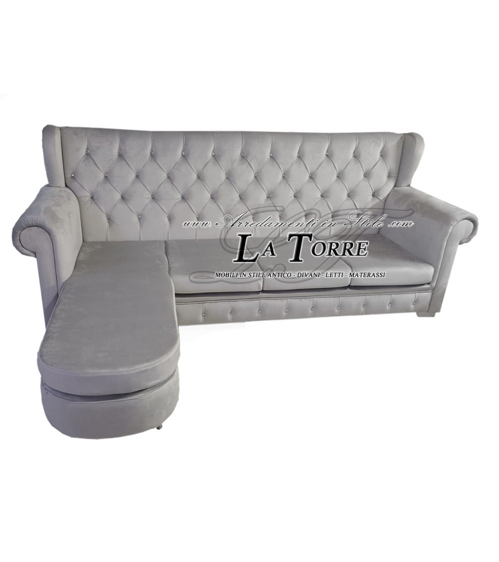 Divano 4 posti con rete e materasso penisola moderno. Il divano è rivestito in un lussuoso tessuto vellutato di colore grigio chiaro o tortora, una tonalità neutra che si adatta a diversi schemi cromatici e stili d'arredo, conferendo un'atmosfera di sofisticata luminosità. La parte più distintiva del divano è lo schienale alto e i braccioli, entrambi impreziositi da una profonda trapuntatura a capitonné. Questa lavorazione, realizzata con bottoni che creano un motivo a losanghe, aggiunge un tocco di eleganza classica e profondità visiva. I braccioli hanno una forma curva e avvolgente, tipica dello stile Chesterfield, che invita al relax. La parte inferiore frontale del divano riprende anch'essa la trapuntatura a capitonné, garantendo continuità stilistica. La configurazione angolare è data da una chaise longue separata, ma perfettamente accostabile al divano. Le gambe, sono in legno massello.