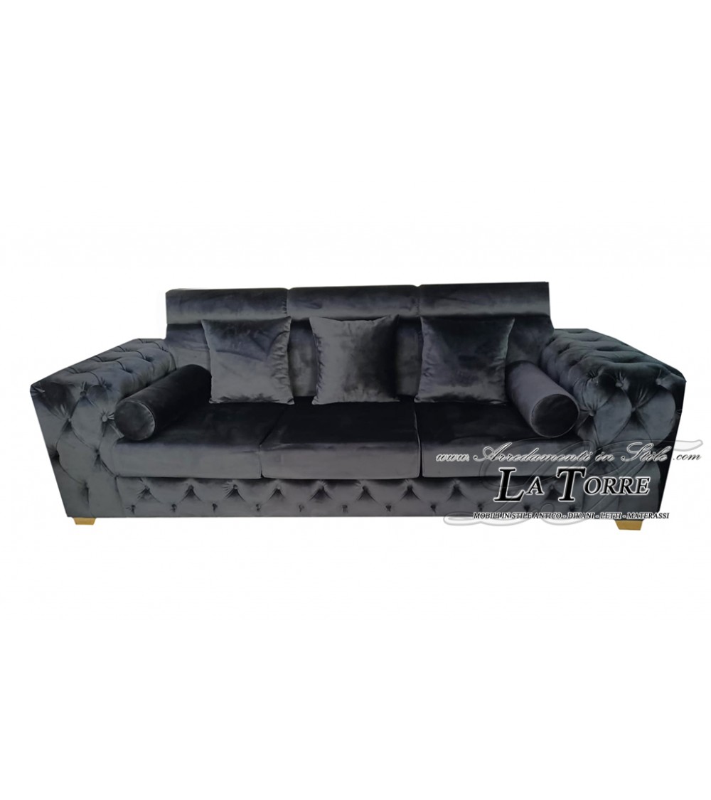 Elegante divano a tre posti, caratterizzato da un design classico e lussuoso. Il divano è rivestito in un velluto nero, che conferisce un aspetto sofisticato e moderno. La lavorazione capitonné, con i bottoni che creano un motivo a rombi, è evidente sulla parte esterna della struttura, aggiungendo un elemento di dettaglio e texture. I cuscini della seduta sono imbottiti nello stesso velluto nero, offrendo comfort e uniformità estetica. Tre cuscini aggiuntivi, uno leggermente più chiaro al centro, sono posizionati sullo schienale, contribuendo a un senso di accoglienza e morbidezza. Due cuscini cilindrici, rivestiti nello stesso velluto, sono posizionati ai lati dei braccioli, aggiungendo un tocco di originalità e comfort. Il divano è sostenuto da piedini bassi in legno dorato, appena visibili, che aggiungono un tocco di eleganza discreta. Il divano poggia su quattro piedini bassi in legno dorato, che aggiungono un tocco di eleganza.
