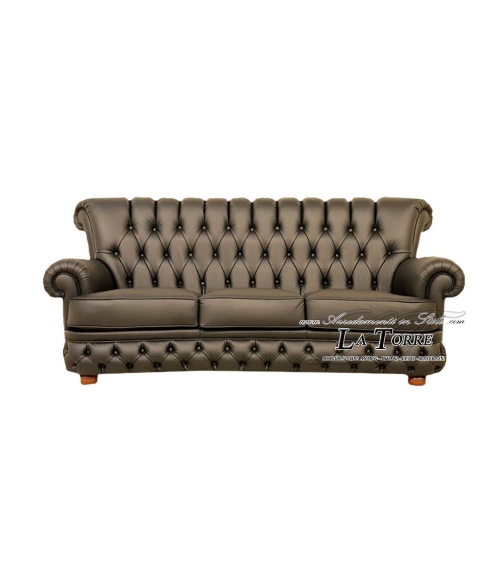 Elegante divano a tre posti in stile Chesterfield incarna un'eleganza classica e senza tempo. Il divano è interamente rivestito in pregiata pelle marrone scuro, che conferisce un aspetto lussuoso e sofisticato all'ambiente. La caratteristica distintiva dello stile Chesterfield è evidente nella profonda lavorazione capitonné che riveste l'intera struttura, dalla testiera allo schienale, ai braccioli e alla base. I bottoni affondati creano un motivo a rombi che aggiunge un elemento di dettaglio e texture iconico. I braccioli sono ampi e arrotondati, con un caratteristico design a "rotolo" che invita al relax e al comfort. La seduta è ampia e ben imbottita, promettendo un'esperienza di seduta confortevole per tre persone. I piccoli piedini in legno scuro, appena visibili, sollevano leggermente il divano da terra, contribuendo a definire la sua silhouette classica.