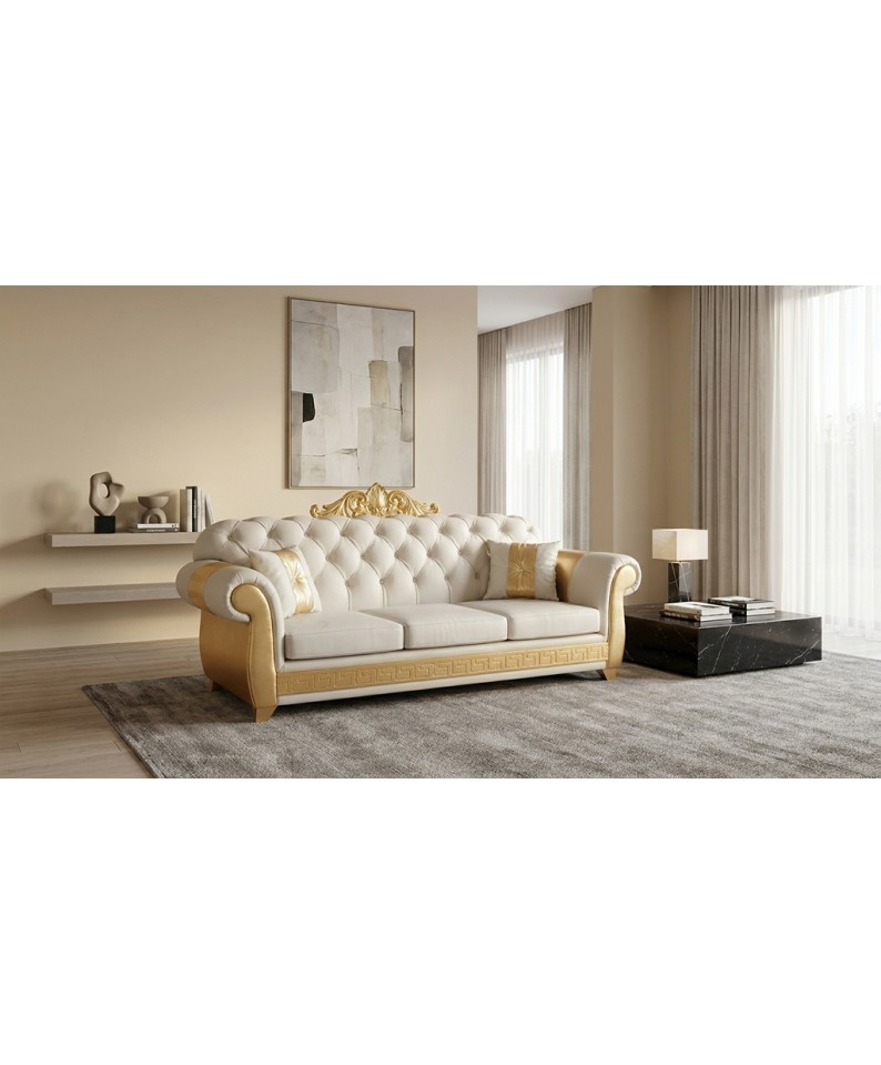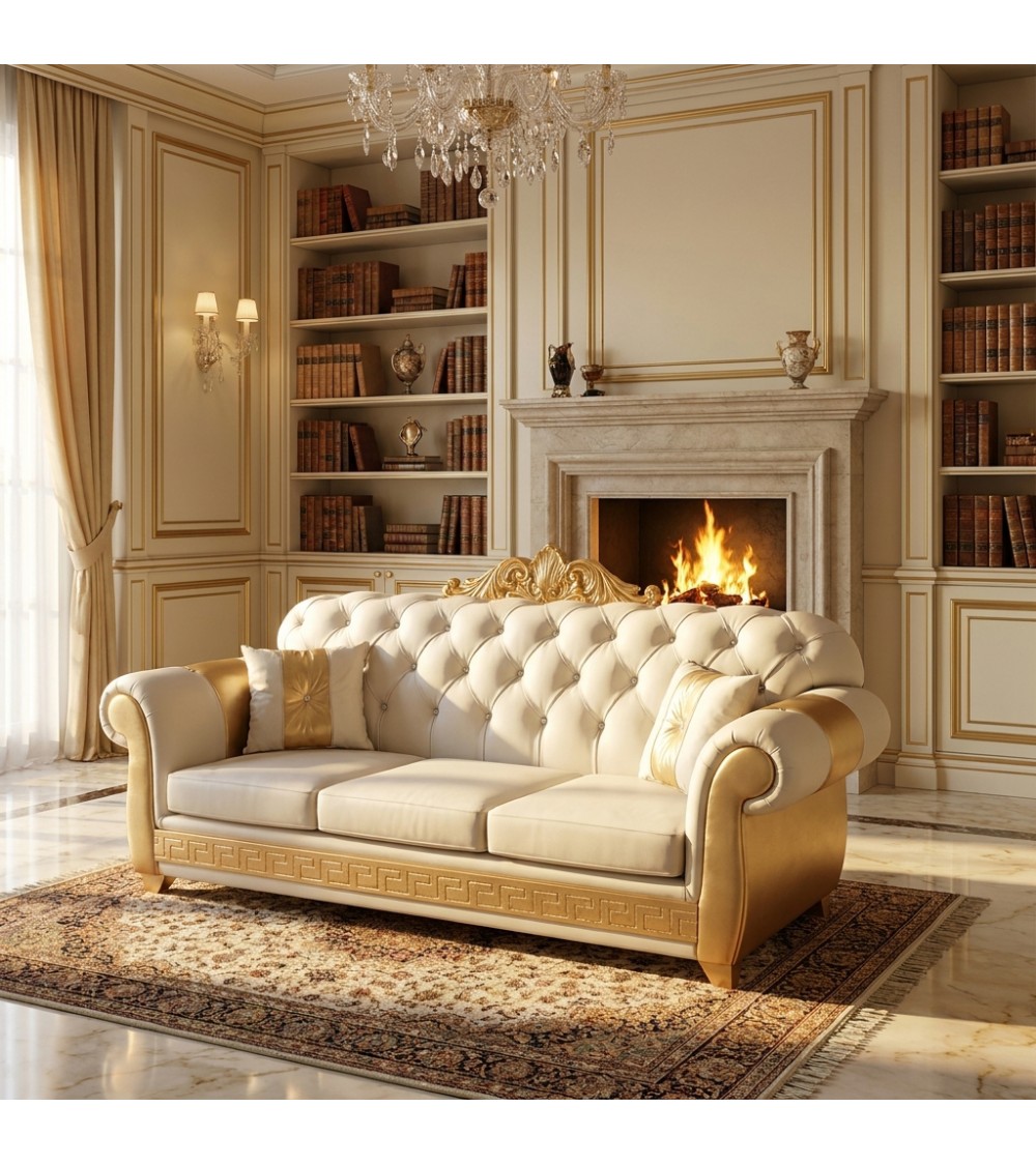 Il Divano Letto Chesterfield 3 Posti AZ03C in raffinata finitura avorio e oro rappresenta un perfetto equilibrio tra eleganza classica, comfort moderno e forte impatto scenografico. Un complemento d’arredo pensato per ambienti importanti, capace di valorizzare lo spazio con uno stile ricercato e senza tempo.