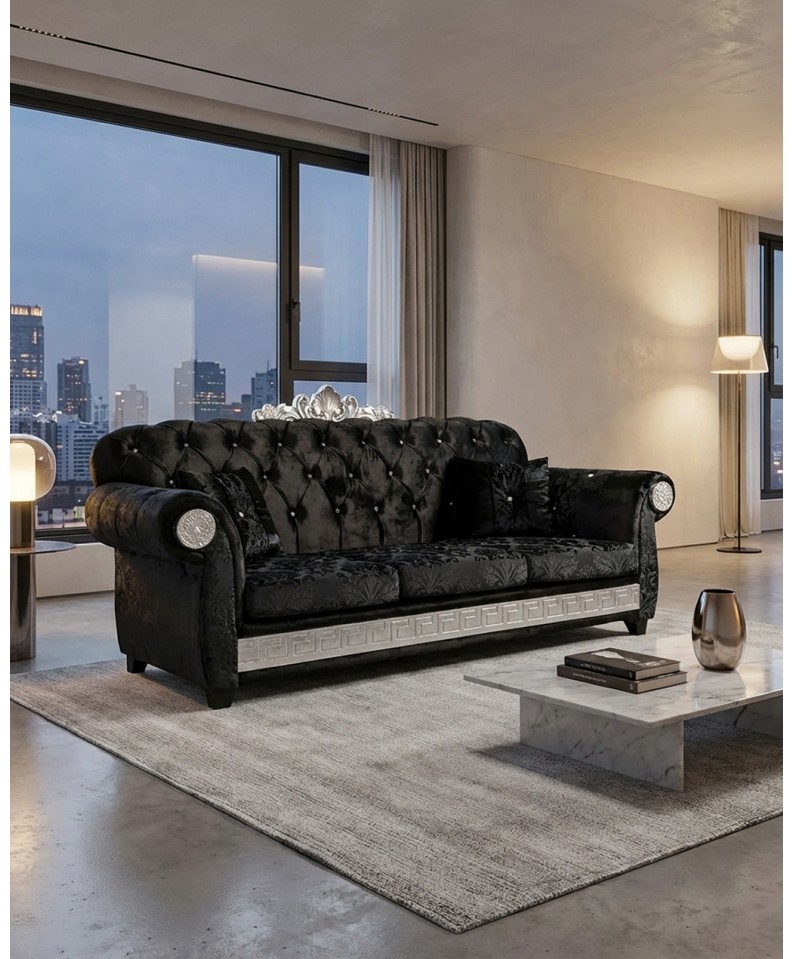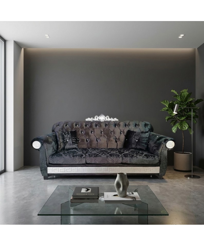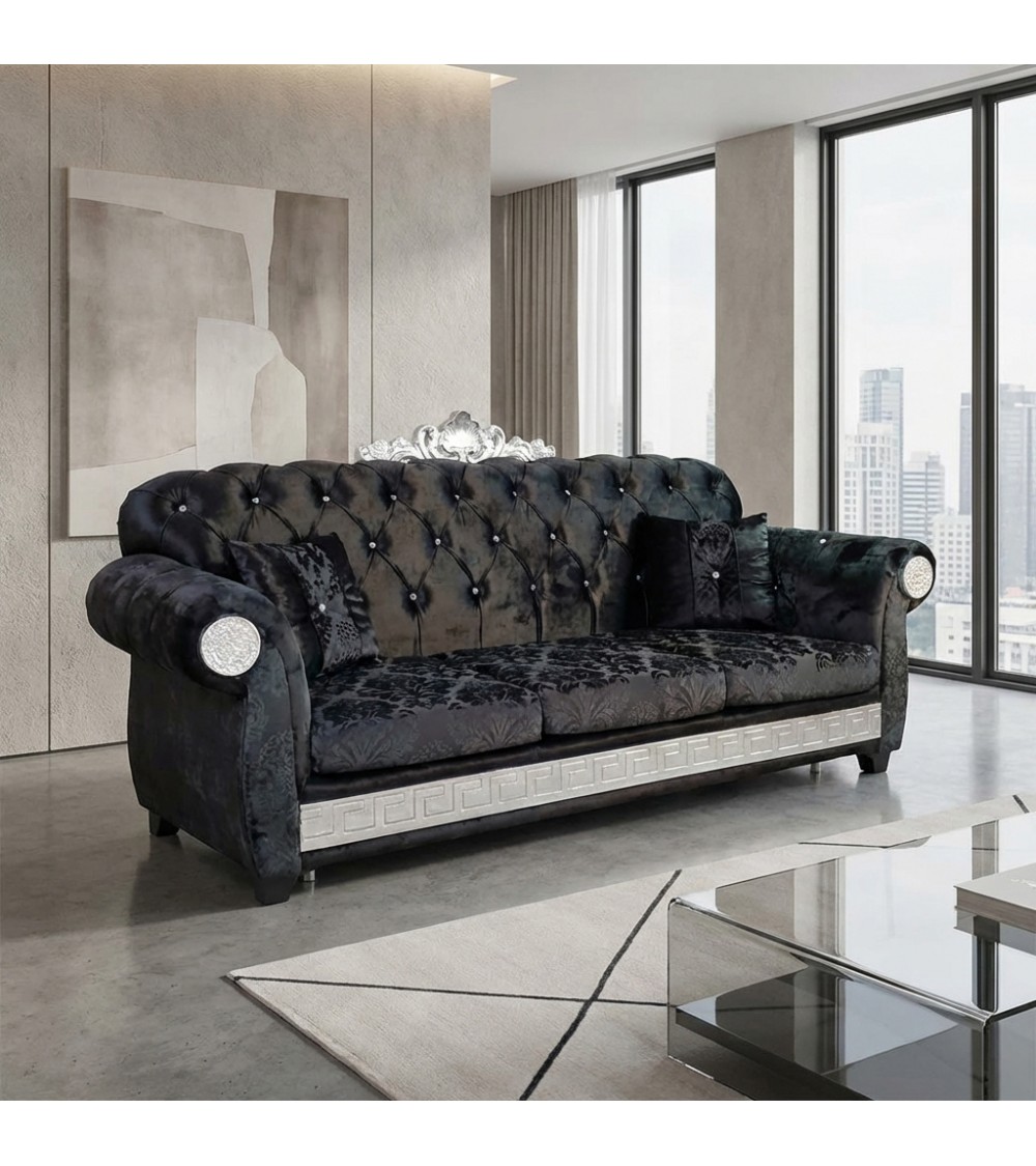 Il Divano Chesterfield 3 Posti AZ03C è un complemento d’arredo elegante e scenografico che unisce il fascino dello stile classico alla raffinatezza del design contemporaneo. Questa versione si distingue per il sofisticato rivestimento damascato nero impreziosito da raffinati particolari color argento, creando un contrasto visivo elegante e di grande impatto.