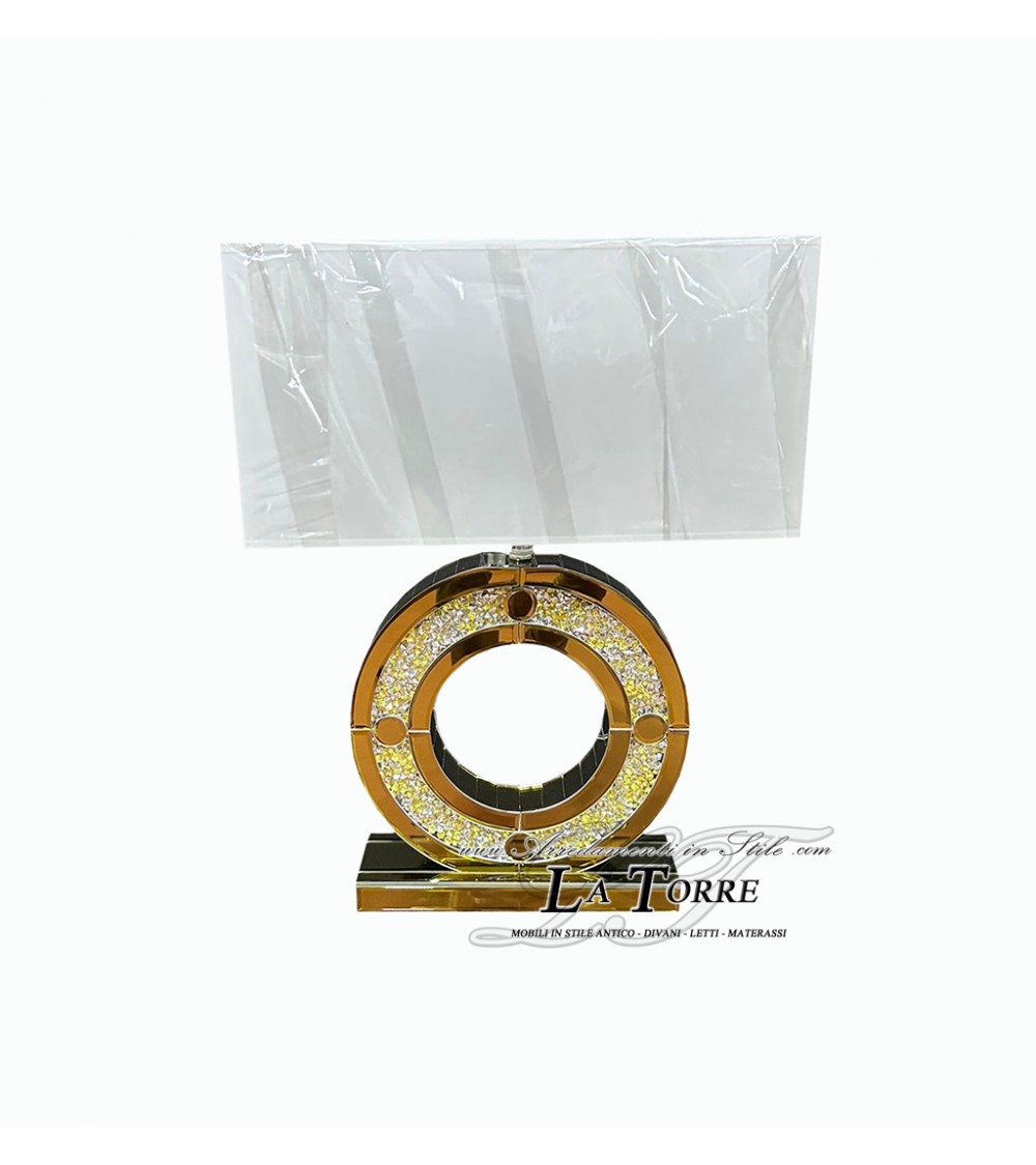 Aggiungi un tocco di eleganza e prestigio ai tuoi ambienti con questa lampada da tavolo moderna, caratterizzata da una base circolare specchiata impreziosita da cristalli Swarovski incastonati.