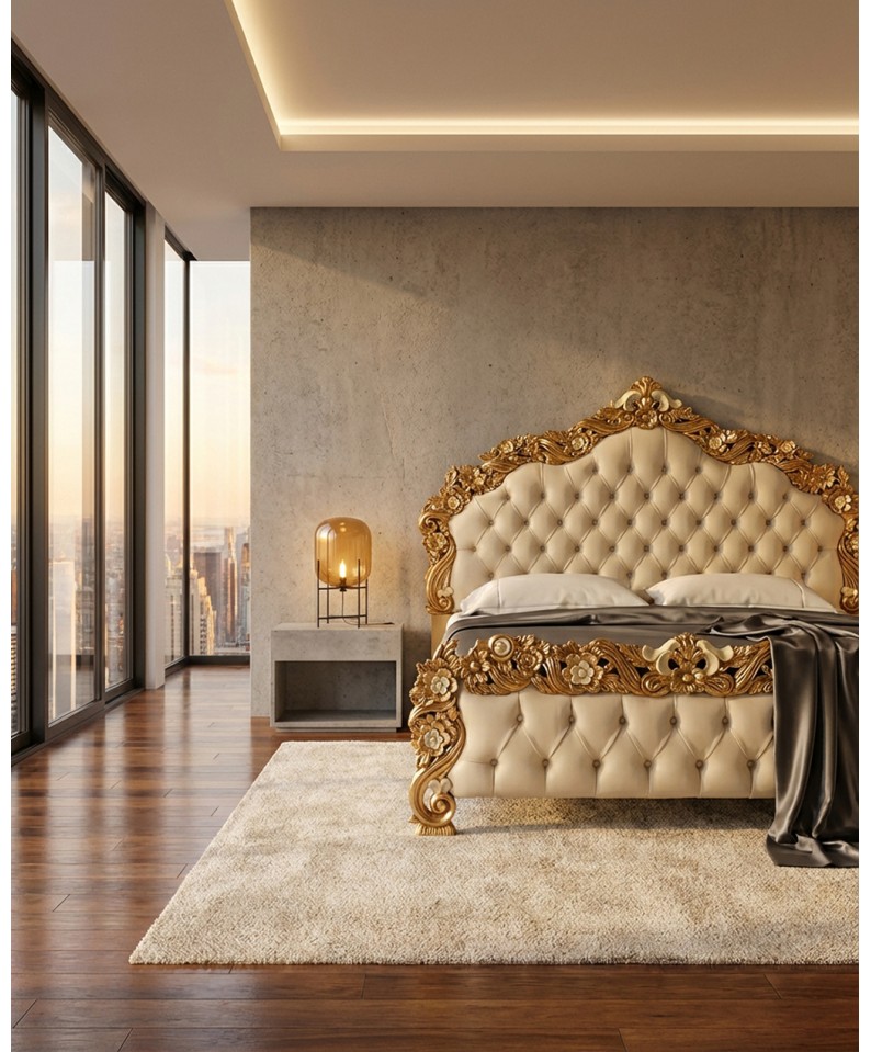 La versione proposta presenta struttura in foglia oro e rivestimento in ecopelle avorio, una combinazione luminosa e prestigiosa. La lavorazione capitonné su testata e pediera dona morbidezza, profondità e un’eleganza senza tempo.
