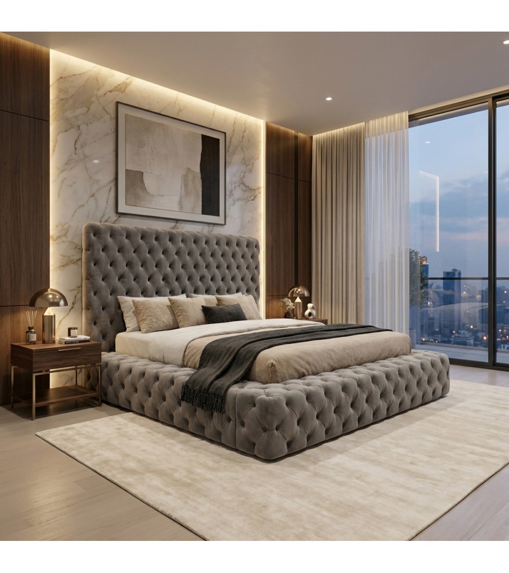 La maestosa testiera alta, con linee geometriche e imbottitura strutturata, dona profondità e carattere all’ambiente, trasformando il letto nel vero protagonista della stanza.