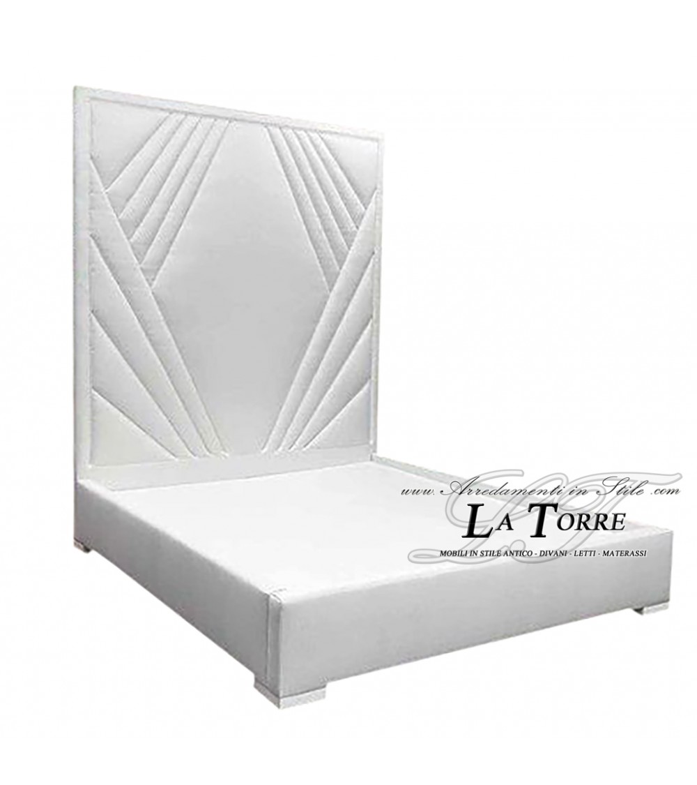 Letto matrimoniale si distingue per il suo design elegante e sofisticato, caratterizzato da linee geometriche e un forte impatto visivo. La testiera, alta e imponente, è il punto focale del letto, con un motivo a rilievo di linee rette e forme romboidali che creano un interessante effetto tridimensionale. Il rivestimento in tessuto bianco, liscio e luminoso, esalta le forme geometriche e conferisce un'aura di lusso discreto.