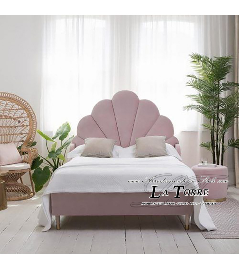 Letto matrimoniale si distingue per il suo design romantico e sofisticato, caratterizzato da una testiera a forma di conchiglia. La testiera, alta e imponente, è rivestita in un morbido tessuto vellutato di un delicato rosa cipria, che aggiunge un tocco di eleganza e femminilità alla camera. La forma a conchiglia, con le sue linee morbide e sinuose, crea un'atmosfera accogliente e rilassante, invitando al riposo e al relax.