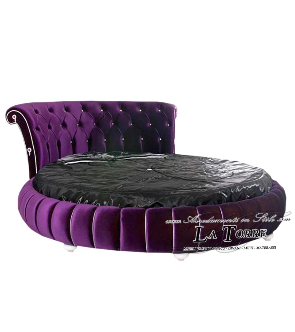 Letto matrimoniale circolare si distingue per il suo design lussuoso e originale, caratterizzato da una testiera alta e curva. La testiera, interamente rivestita in un morbido velluto viola intenso, presenta una lavorazione capitonné con bottoni che creano un motivo a rombi, aggiungendo un tocco di eleganza e texture.