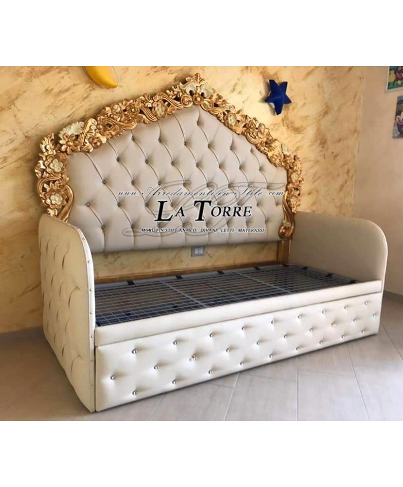 Divano Letto singolo cassettone cameretta barocco in legno foglia oro ecopelle o vellutino avorio qualsiasi colore Pilissena