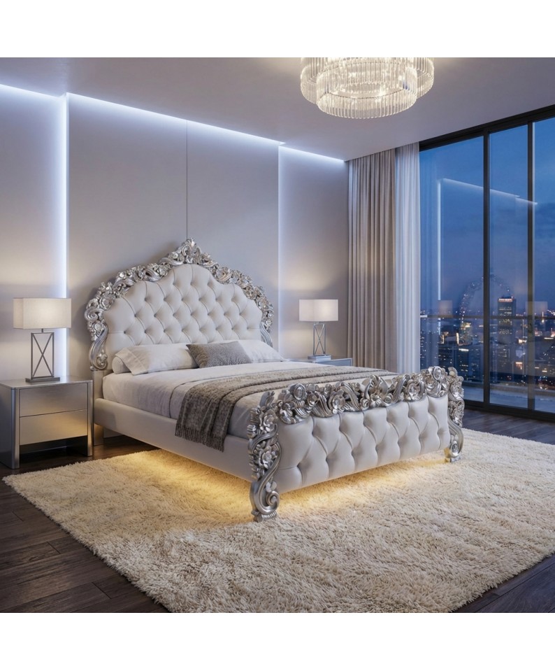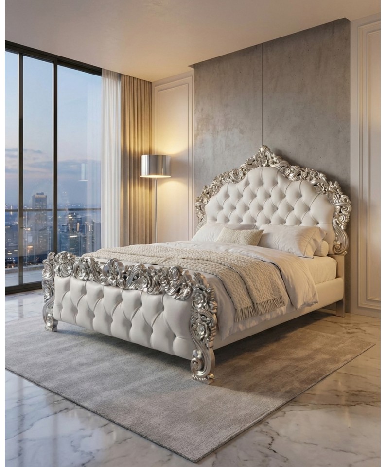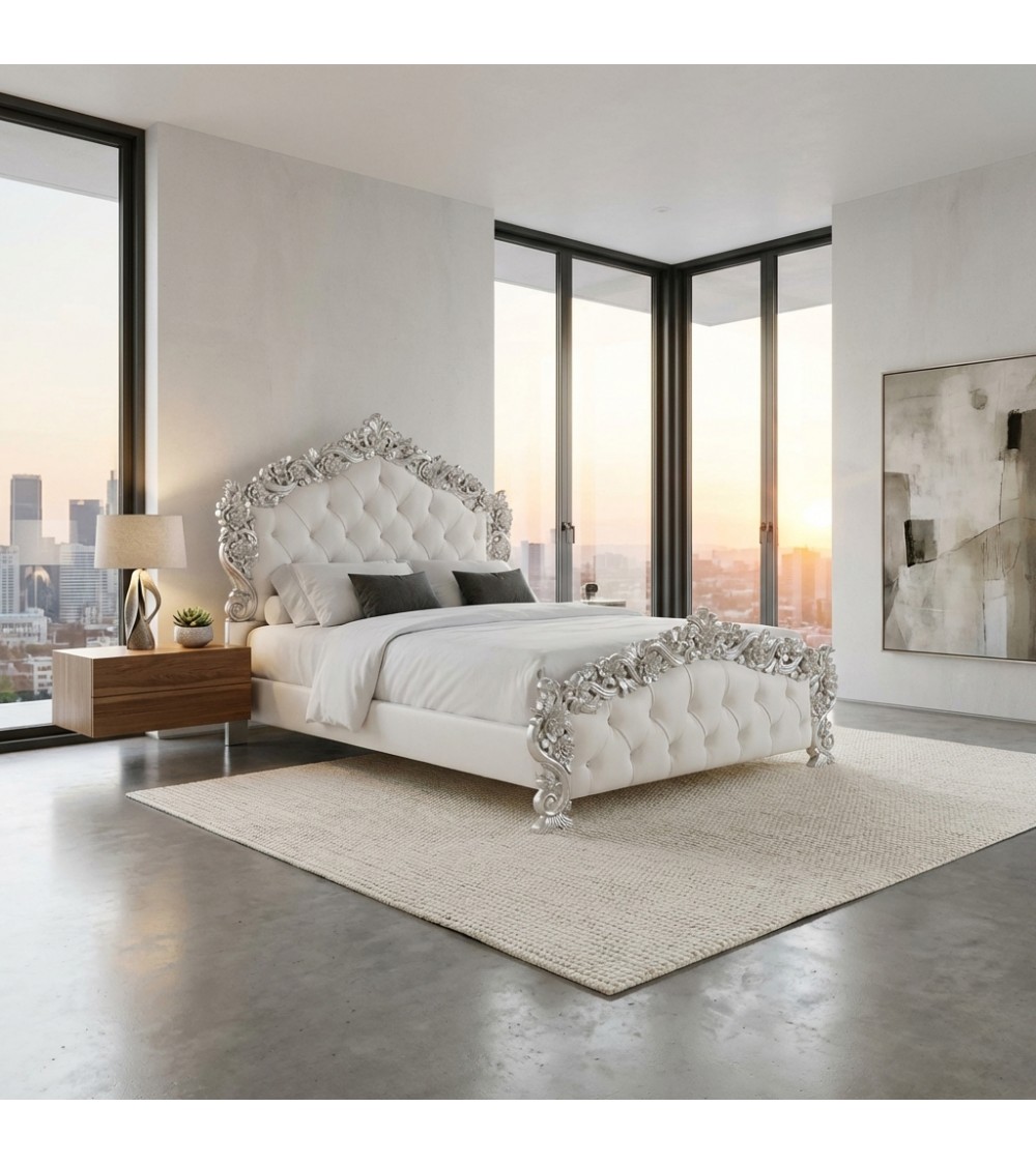 Il rivestimento in ecopelle bianca valorizza la lavorazione capitonné con bottoni che creano il classico motivo trapuntato a losanghe, simbolo di eleganza senza tempo. Le decorazioni scolpite e le forme sinuose della struttura rendono questo letto un vero elemento d’arredo di grande impatto visivo.