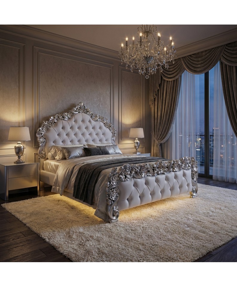 Il letto barocco Pilissena da una piazza e mezza è un elegante complemento d’arredo capace di trasformare la camera da letto in uno spazio raffinato e scenografico. La maestosa testata capitonné, impreziosita da lavorazioni intagliate in stile barocco e rifinita in foglia argento, dona prestigio e luminosità all’ambiente.
