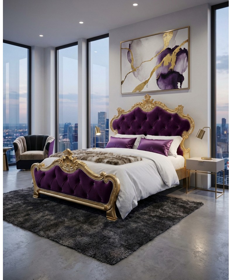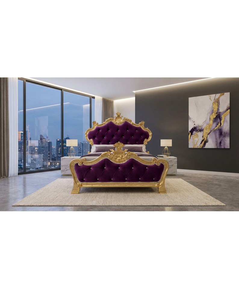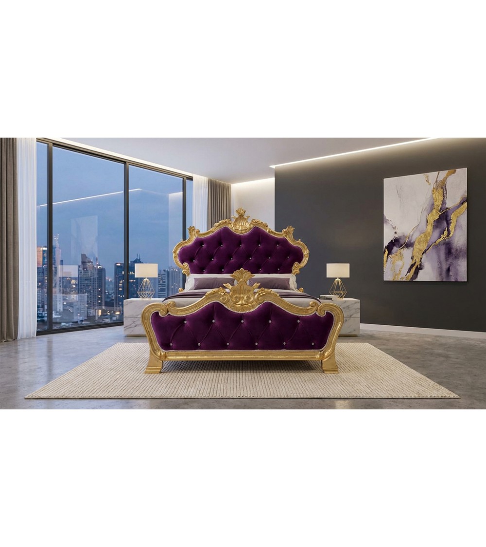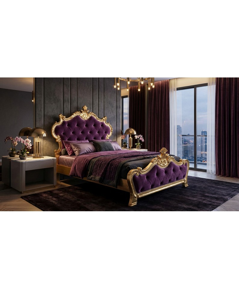 Raffinato Letto Piazza e Mezza in stile Barocco modello Beatrice, realizzato artigianalmente e caratterizzato da una struttura maestosa in legno finitura foglia oro abbinata a un’elegante imbottitura capitonné in velluto. Un complemento d’arredo scenografico, ideale per chi desidera una camera da letto esclusiva, elegante e di forte personalità.