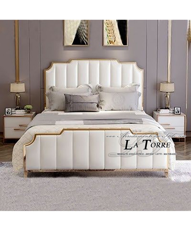 La base del letto, anch'essa rivestita in tessuto bianco, riprende il design della testiera, creando un'armonia visiva. Una cornice dorata incornicia la testiera e la base del letto, aggiungendo un tocco di lusso e raffinatezza.