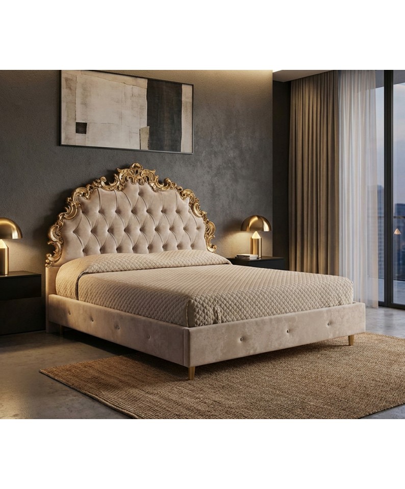 Imponente ed elegante Letto Matrimoniale Barocco Samira, realizzato artigianalmente in legno con preziosi intagli decorativi che richiamano lo stile classico barocco. Un modello scenografico, raffinato e di grande impatto visivo, perfetto per camere da letto di lusso e ambienti dal gusto ricercato.