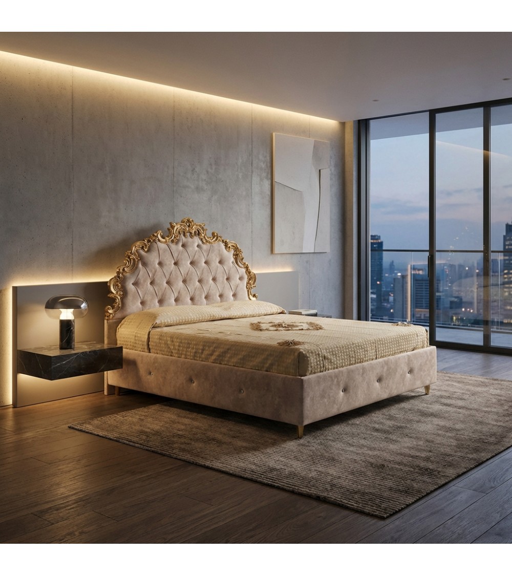 Letto Matrimoniale Barocco Samira con Contenitore in Legno Foglia Oro o Argento Ecopelle Velluto Swarovski Personalizzabile