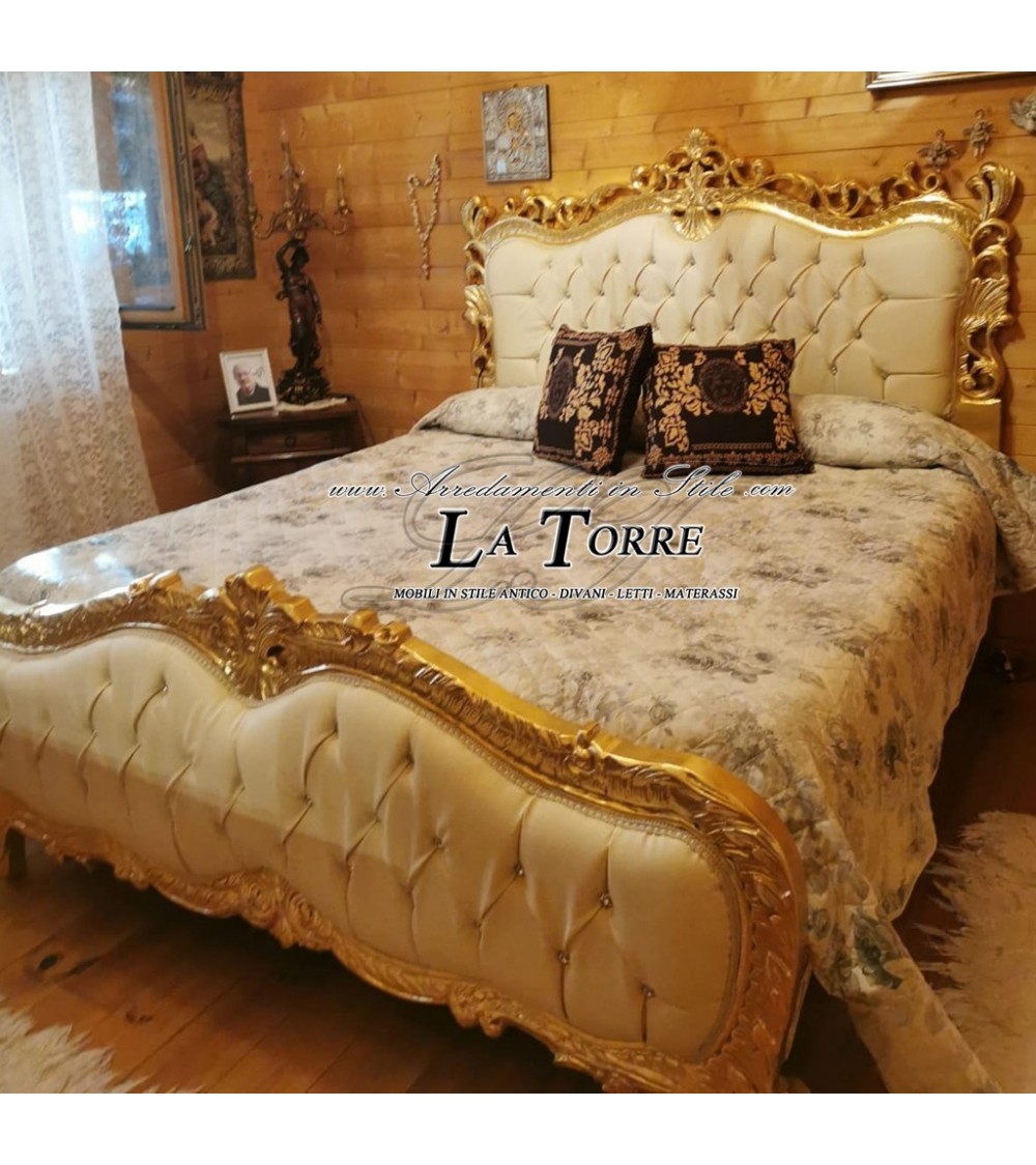 Letto matrimoniale in stile barocco caratterizzato da una ricca finitura in foglia oro. La testata e la pediera sono ampie e intagliate, con imbottitura in ecopelle avorio e bottoni luminosi in swarovski. Le gambe curve e argentate completano il design sfarzoso, ideale per ambienti lussuosi.