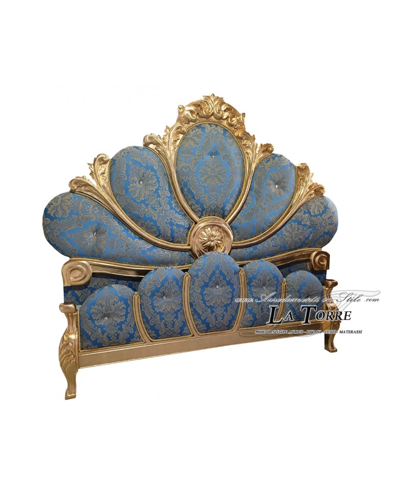 Letto matrimoniale in stile barocco, modello "Emy", che unisce l'opulenza del design d'epoca alla funzionalità moderna di un letto contenitore. La struttura è realizzata in legno massello, impreziosita da una finitura in foglia d'oro o d'argento che esalta gli intagli e le volute tipiche del barocco. Sia la testata che la pediera presentano una sontuosa imbottitura a conchiglia o a ventaglio, rivestita in velluto o ecopelle, con un motivo damascato nei toni del blu e dell'oro. I bottoni capitonné aggiungono un ulteriore tocco di eleganza. Questo letto è una vera e propria opera d'arte, perfetta per una camera da letto che vuole ricreare l'atmosfera di lusso e grandezza tipica delle corti reali.