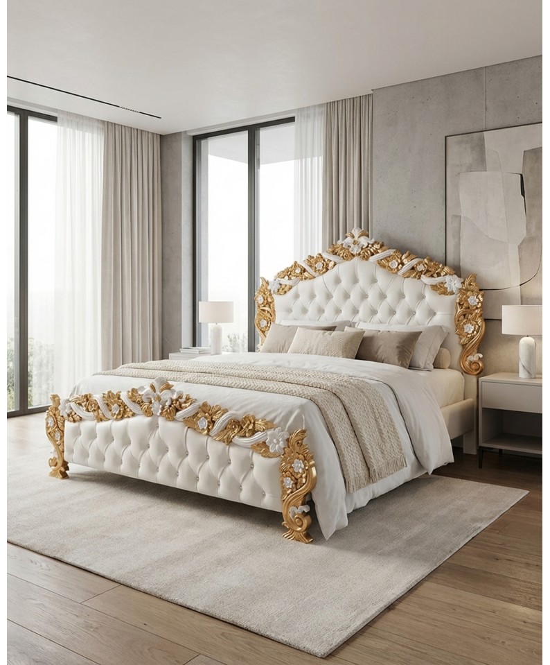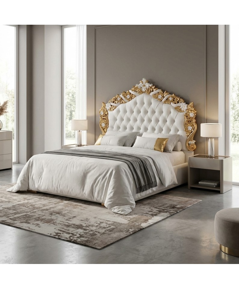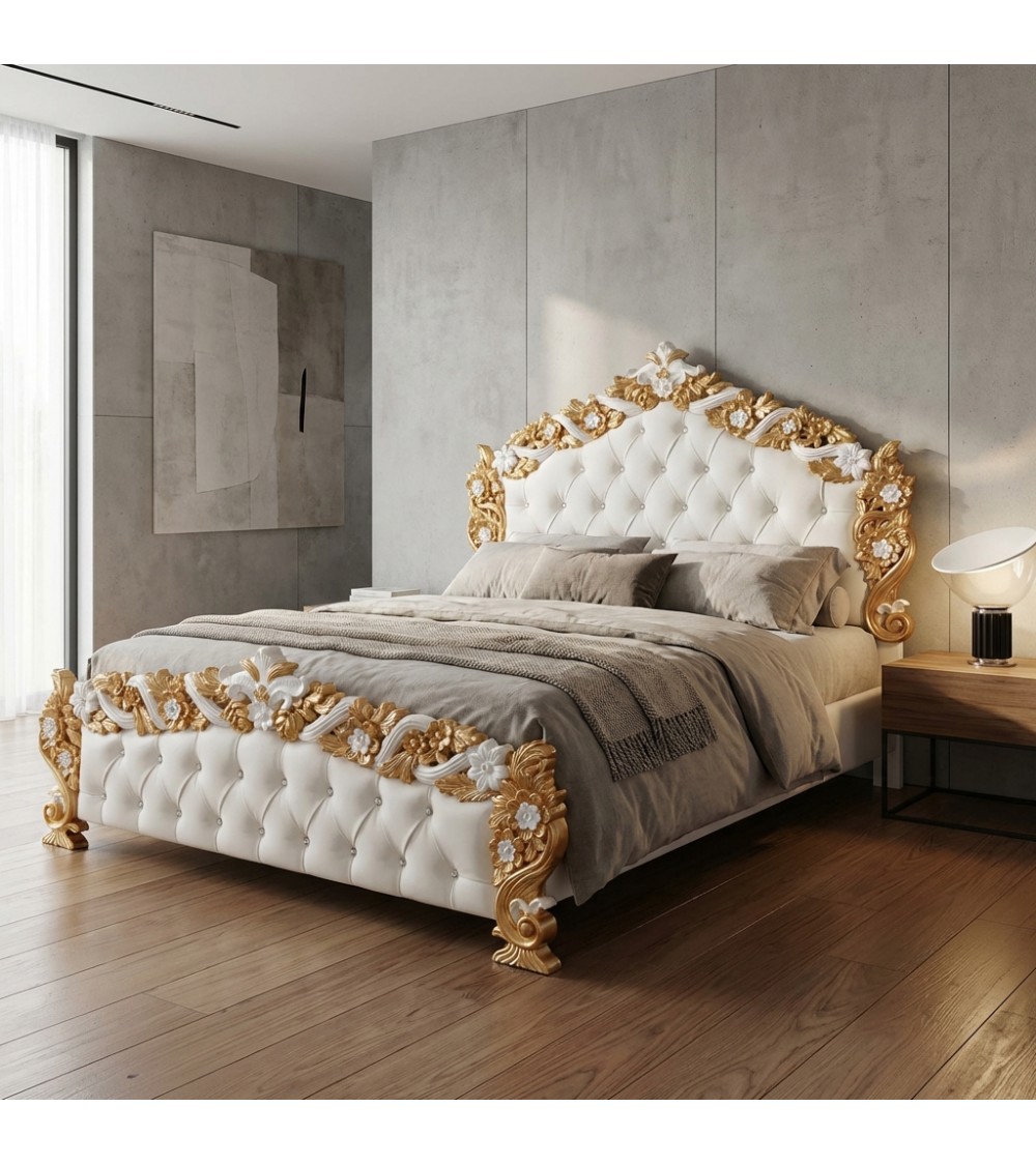 La testata e la pediera, entrambe caratterizzate da una sofisticata lavorazione capitonné, sono rivestite in ecopelle bianca e valorizzate da bottoni decorativi che creano il classico motivo trapuntato a losanghe. Le ricche decorazioni floreali intagliate in stile barocco donano al letto un aspetto maestoso e senza tempo.