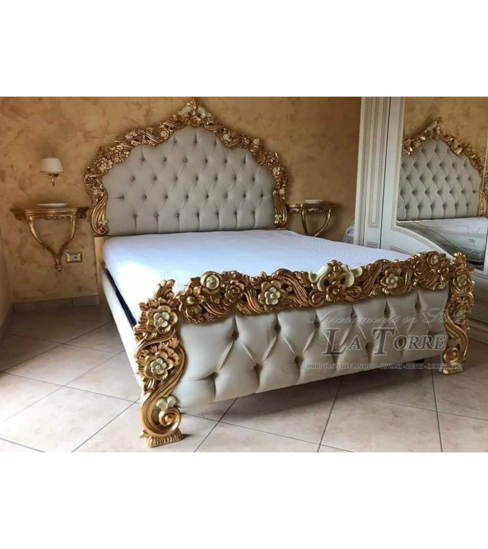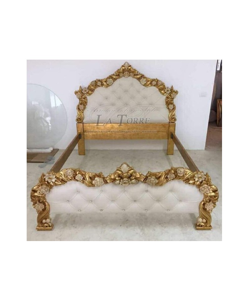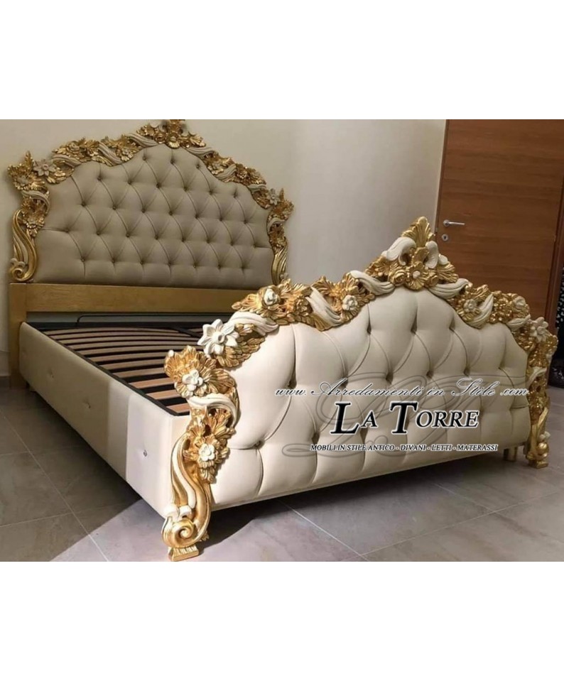 Letto Matrimoniale contenitore ecopelle Barocco legno foglia oro PILISSENA