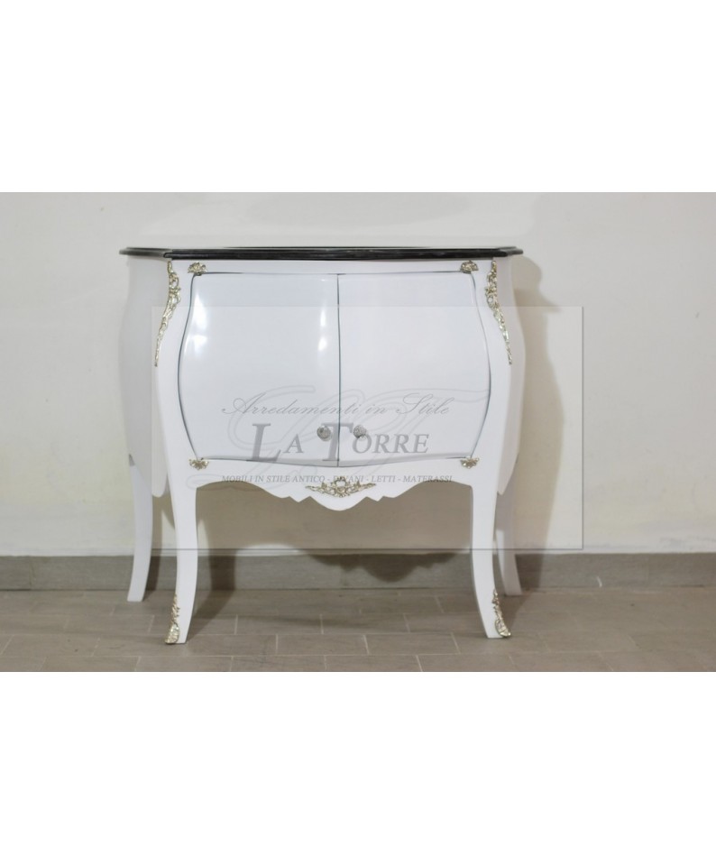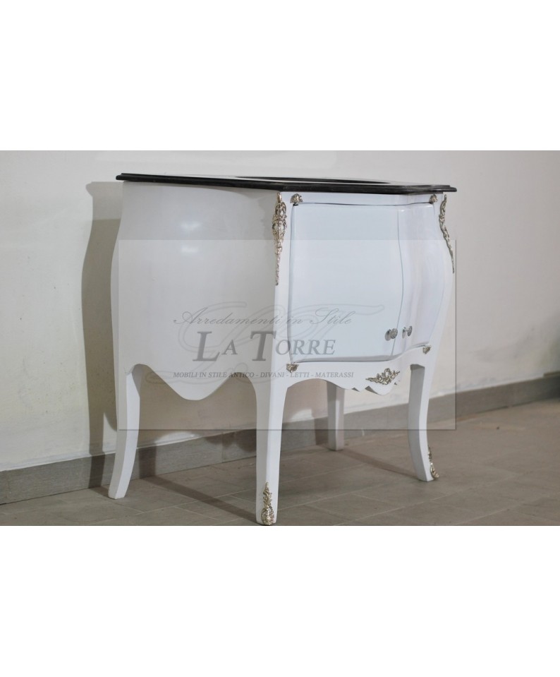 Mobile bagno Luigi XV realizzato in legno, laccata in un delicato colore bianco , che gli conferisce un aspetto fresco e luminoso. Le linee del mobile sono morbide e sinuose, con un frontale bombato e curvo. Il piano superiore è in marmo nero, che contrasta splendidamente con la laccatura chiara del mobile. Al centro del piano è presente un'apertura circolare pretagliata, pronta per l'installazione di un lavabo da incasso. La parte frontale del mobile è dotata di due ante a battente, decorate con applicazioni in foglia argento che ne esaltano le curve. Le maniglie delle ante sono piccole e rotonde, in metallo cromato.