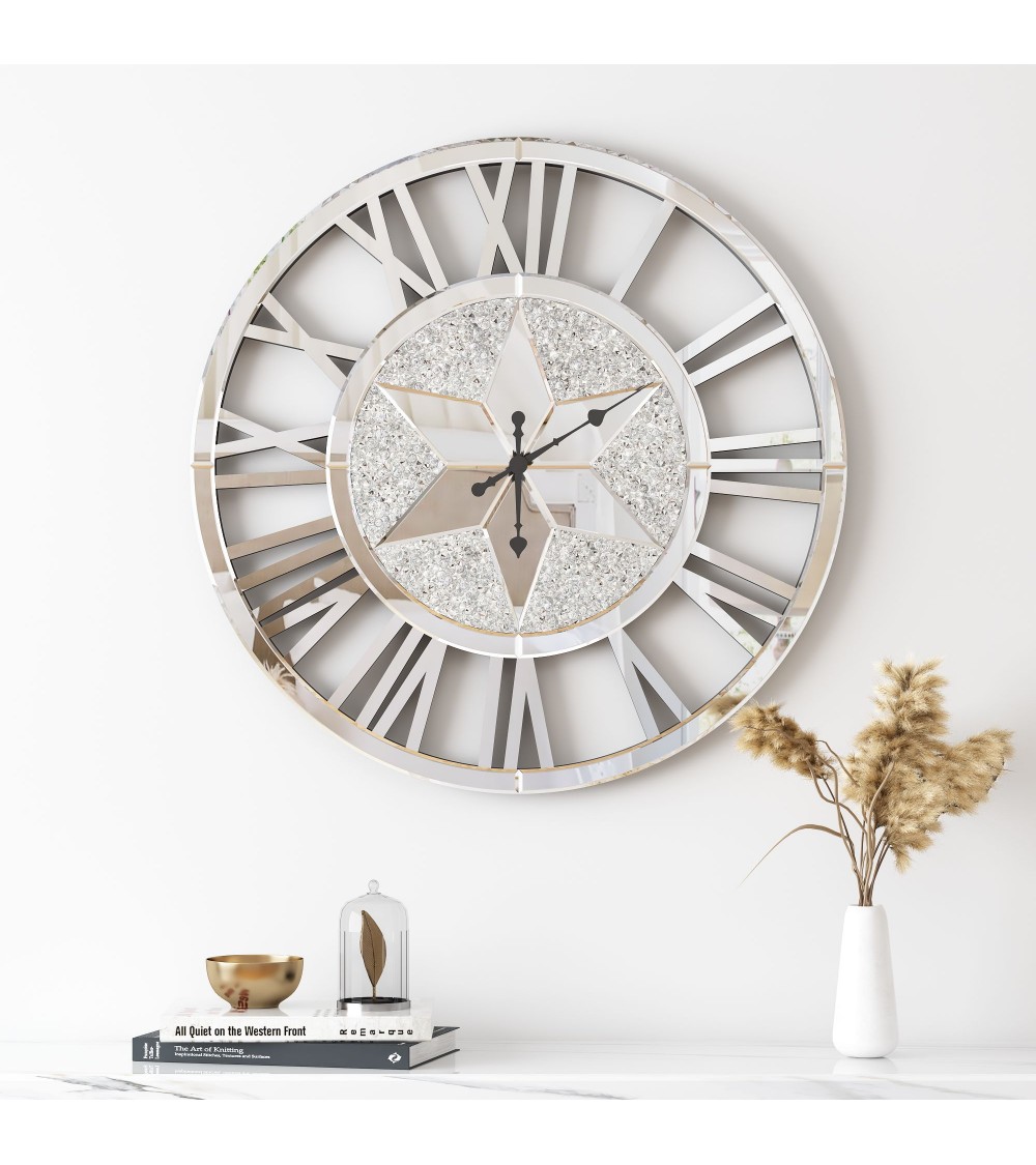 Il design esclusivo con numeri romani e una stella centrale a cinque punte cattura lo sguardo e riflette la luce, creando suggestivi giochi di brillantezza che impreziosiscono qualsiasi parete.