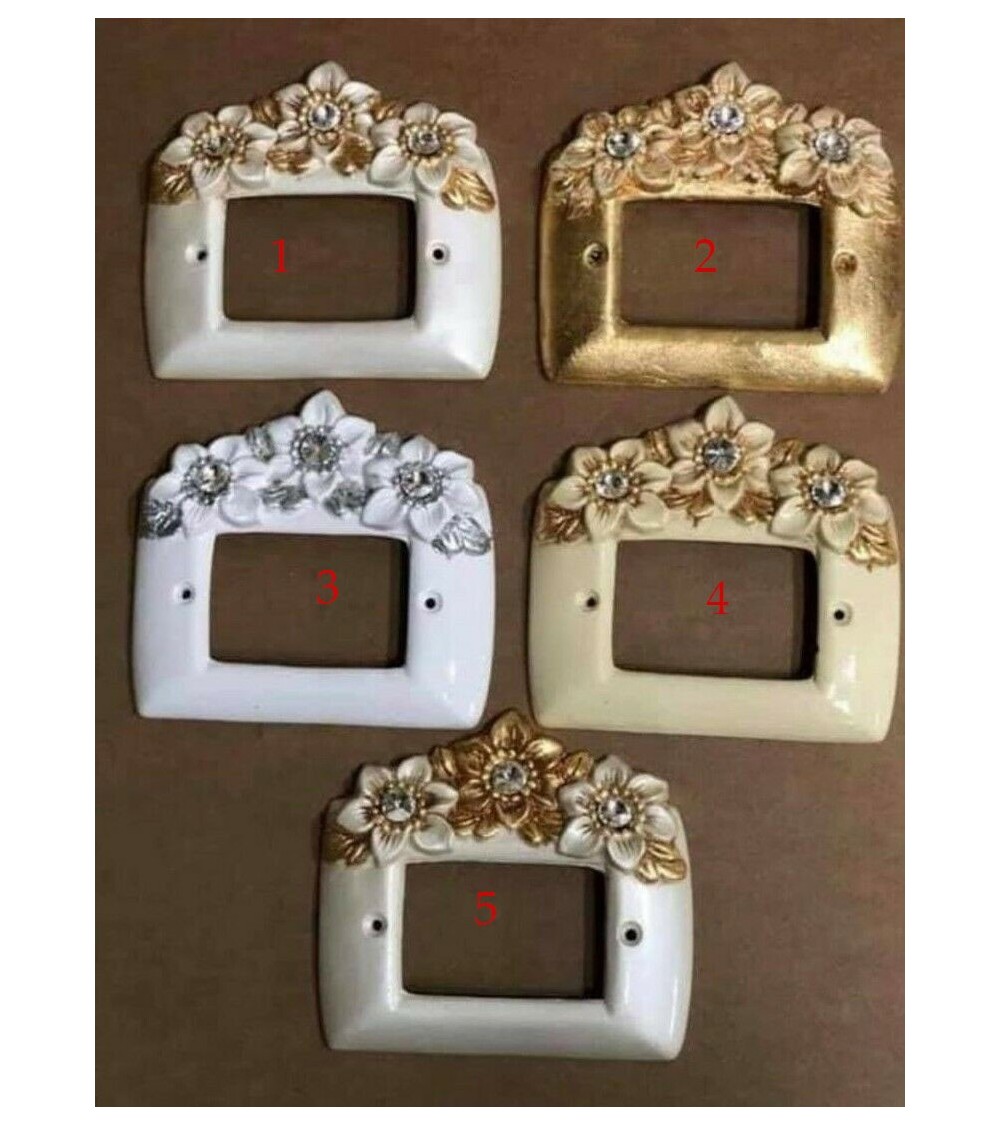 Placchette in ceramica decorative per interruttori con un elaborato motivo floreale in stile barocco sulla parte superiore realizzate in ceramica e decorate a mano. I fiori sono impreziositi da strass lucidi al centro, sono disponibili in varie finiture come bianco avorio con oro o argento e in versione completamente dorata e sono adattabili a modelli come BTicino Living 3 moduli .