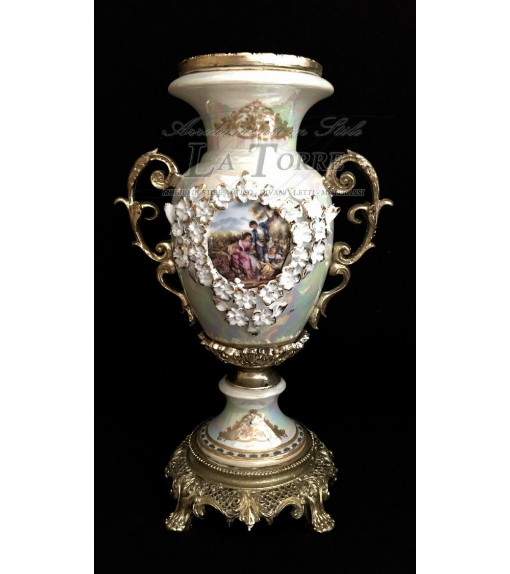 Vaso con manici anfora in porcellana bianca iridescente con applicazioni in metallo dorato. Presenta due anse dorate elaborate con motivi a volute e decorazioni fogliacee. Un medaglione ovale centrale, circondato da applicazioni in porcellana bianca a forma di piccoli fiori, raffigura una scena romantica con figure in un paesaggio. La parte inferiore del vaso e il piedistallo presentano decorazioni dorate e dettagli in porcellana iridescente. L'oggetto poggia su una base dorata finemente lavorata con motivi traforati. Quest'opera d'arte riflette un gusto raffinato e un'estetica lussuosa, tipica dell'artigianato italiano.