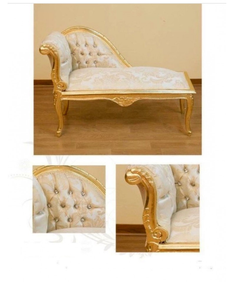 Dormeuse panca romana divano panchetta , sontuosa chaise longue in stile Luigi XV/Rococò, con struttura in legno in foglia oro. La seduta e lo schienale sono imbottiti in tessuto damascato champagne e la testata ricurva sono impreziositi da una lavorazione capitonné, con bottoni in swarovski , che aggiungono brillantezza e un tocco glamour.